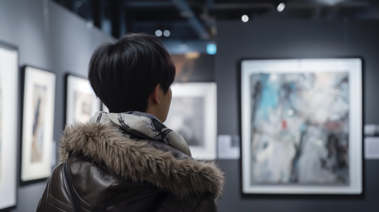 Person in a fur-lined jacket viewing abstract art in a gallery, with soft lighting and a contemplative atmosphere.