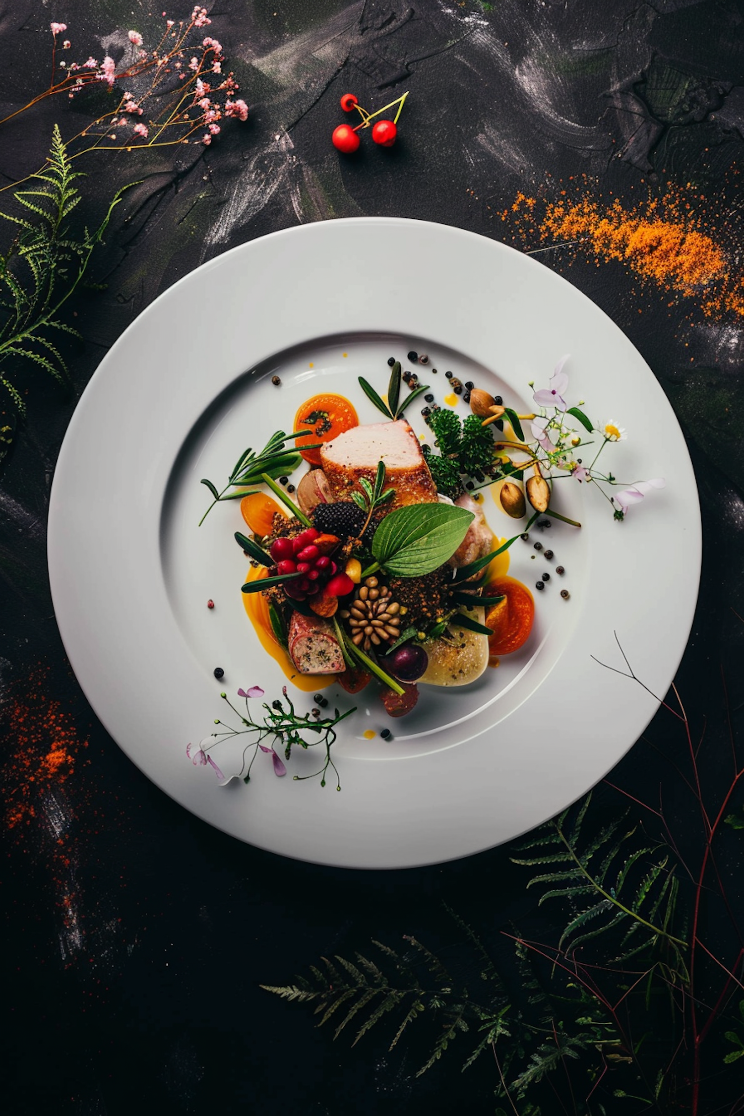 Elegant gourmet dish with seared chicken, vibrant vegetables, herbs, and edible flowers on a white plate with artistic garnishes.