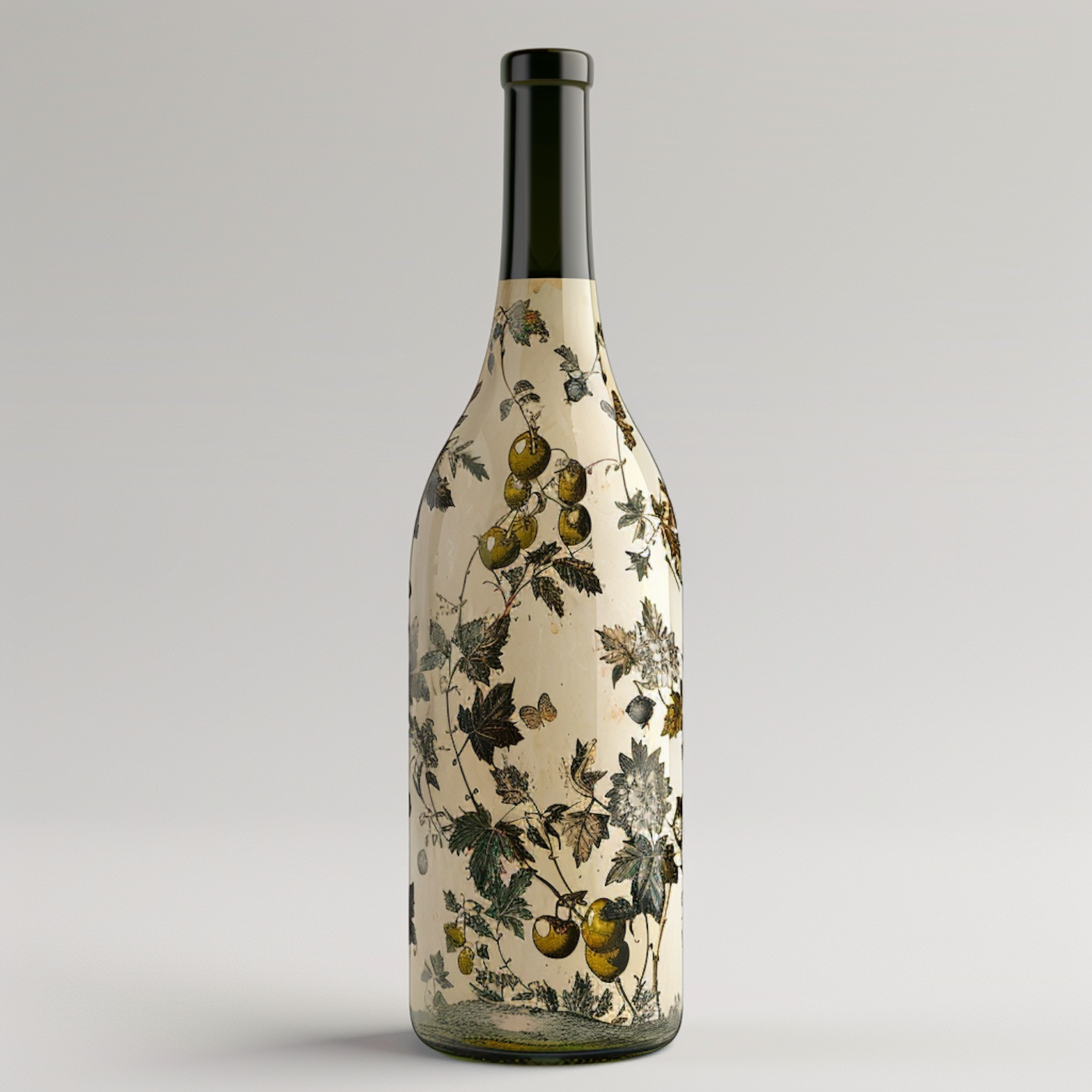 Elegant wine bottle with intricate vine and grape illustrations in earthy tones, creating a vintage charm against a plain background.