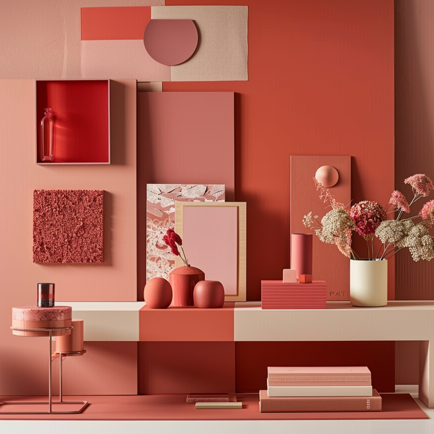 Artistic arrangement of red and pink objects with geometric panels and dried flowers, creating a modern and cohesive aesthetic.