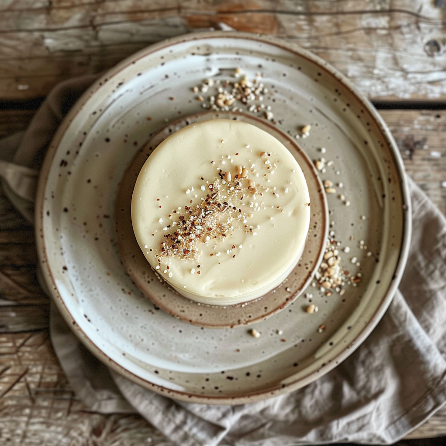 Elegant round cake with creamy frosting and nut topping on a rustic ceramic plate, set on a wooden surface with a soft cloth.