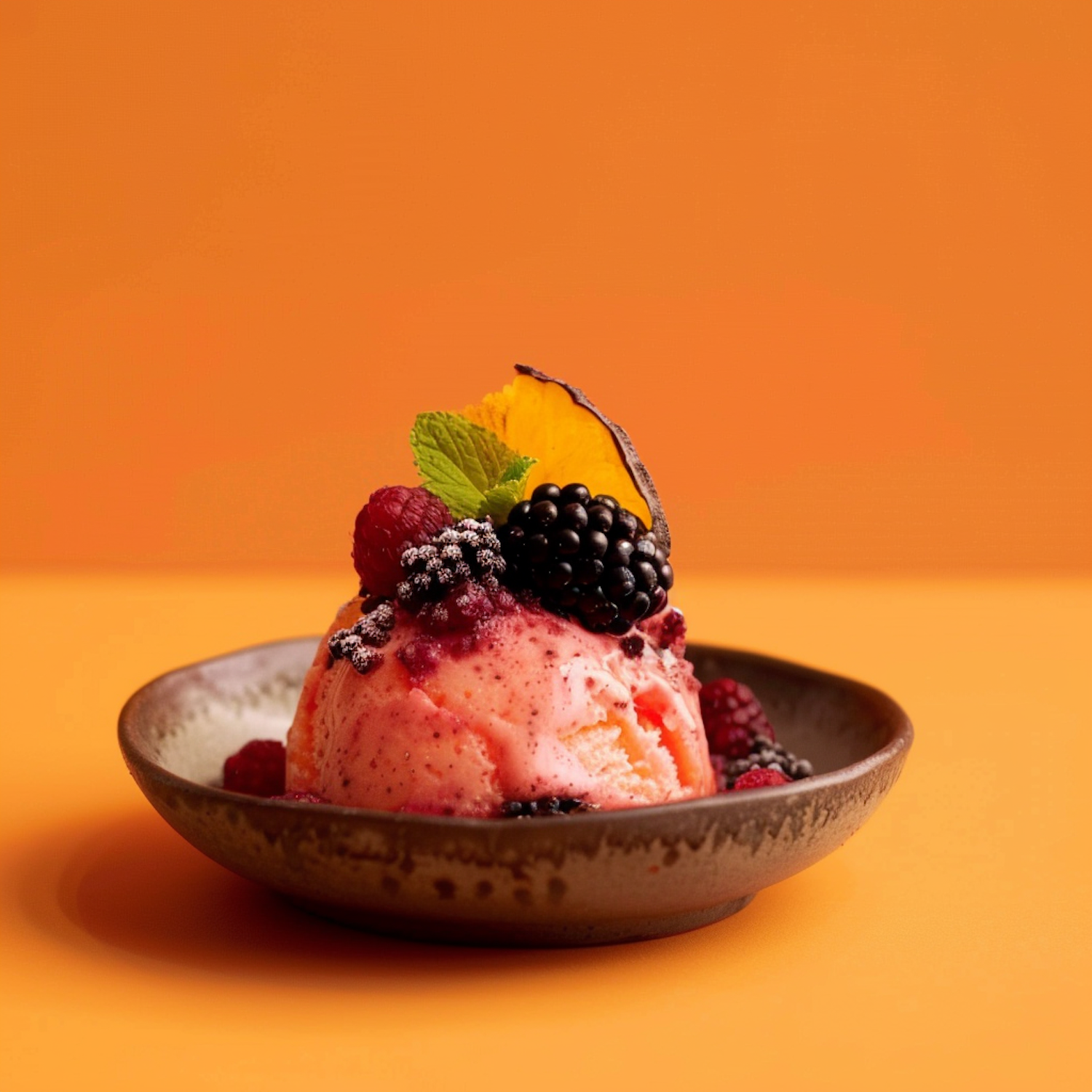 Delicious pink ice cream topped with fresh berries, mint, and dried orange in a rustic bowl against a warm orange background.