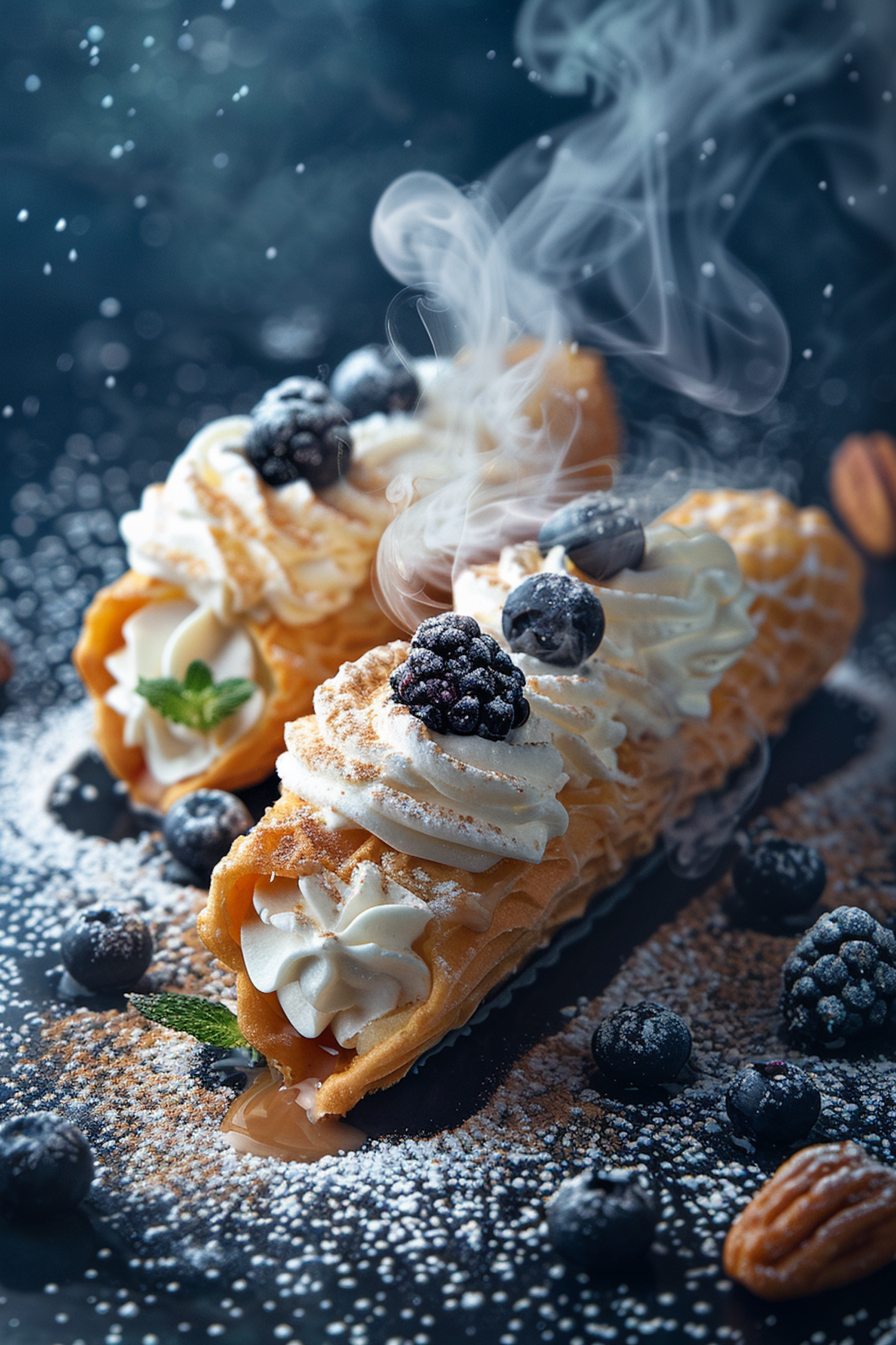 Delicious pastries topped with whipped cream, blackberries, and blueberries, dusted with powdered sugar and surrounded by pecans.