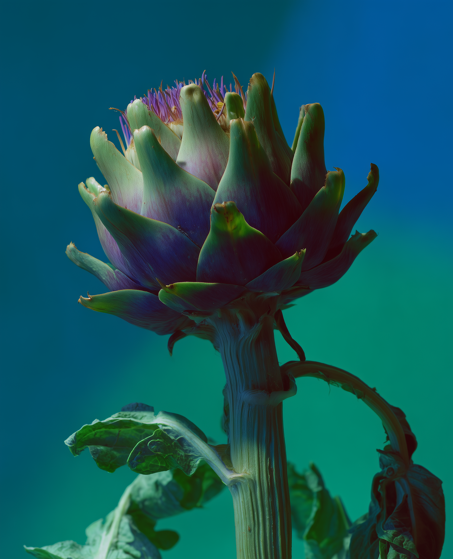 A vibrant close-up of an artichoke plant in bloom, with purple florets and green bracts, set against a gradient blue-green background.
