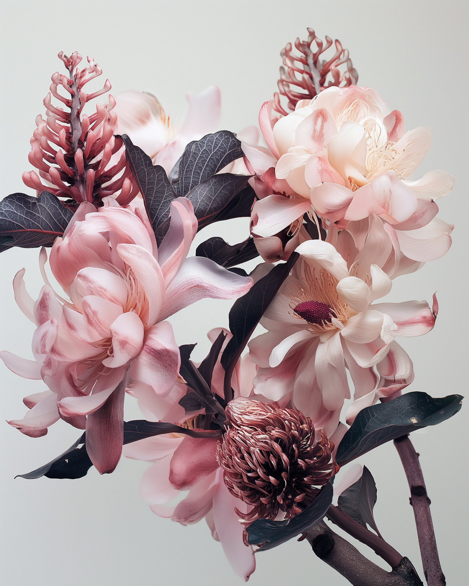 Elegant floral arrangement with pink and cream blooms against a light gray background, featuring dark green leaves for contrast.