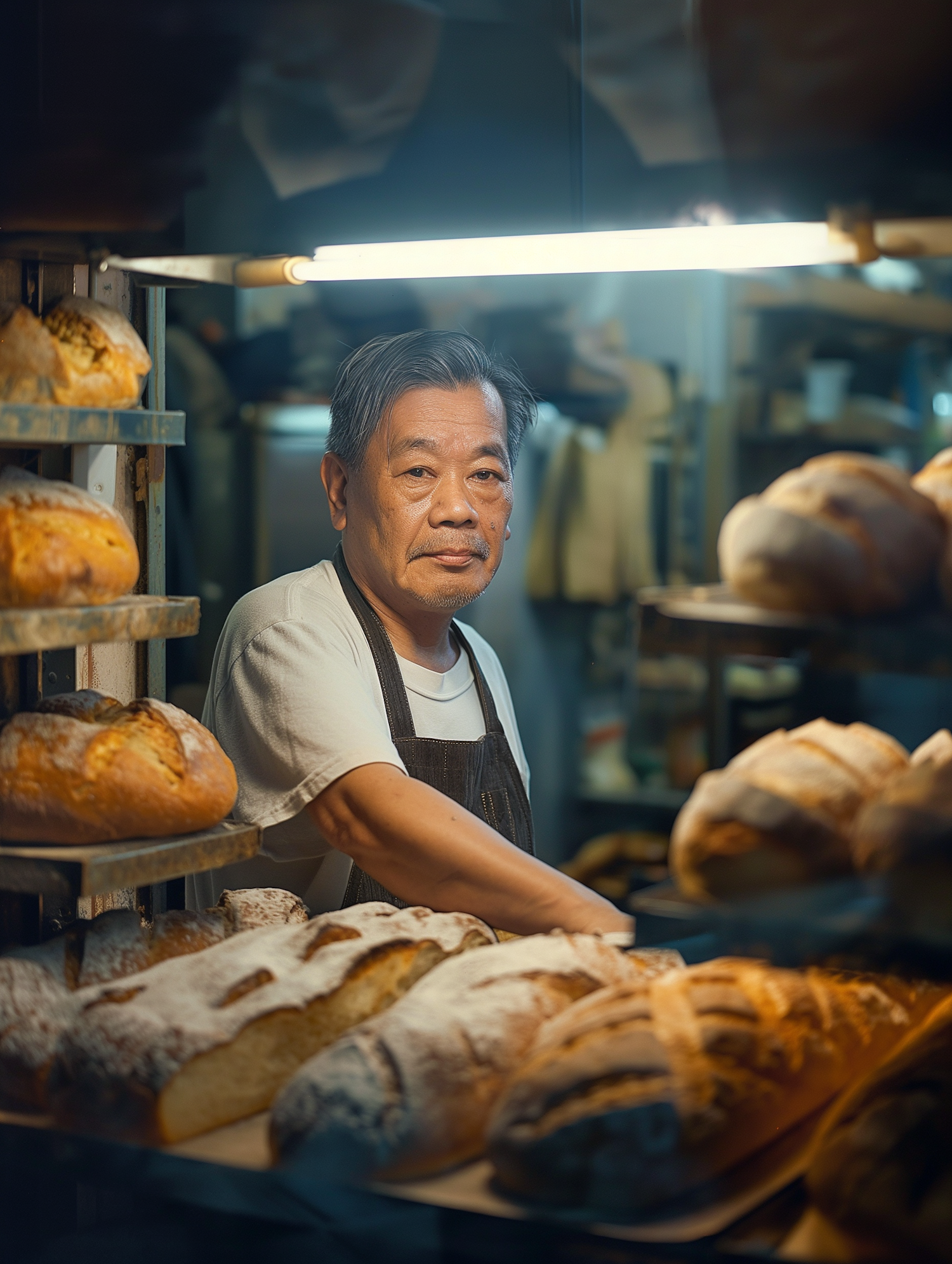 Asian baker in apron stands behind counter with fresh bread, warm lighting highlights his calm expression and the golden loaves.