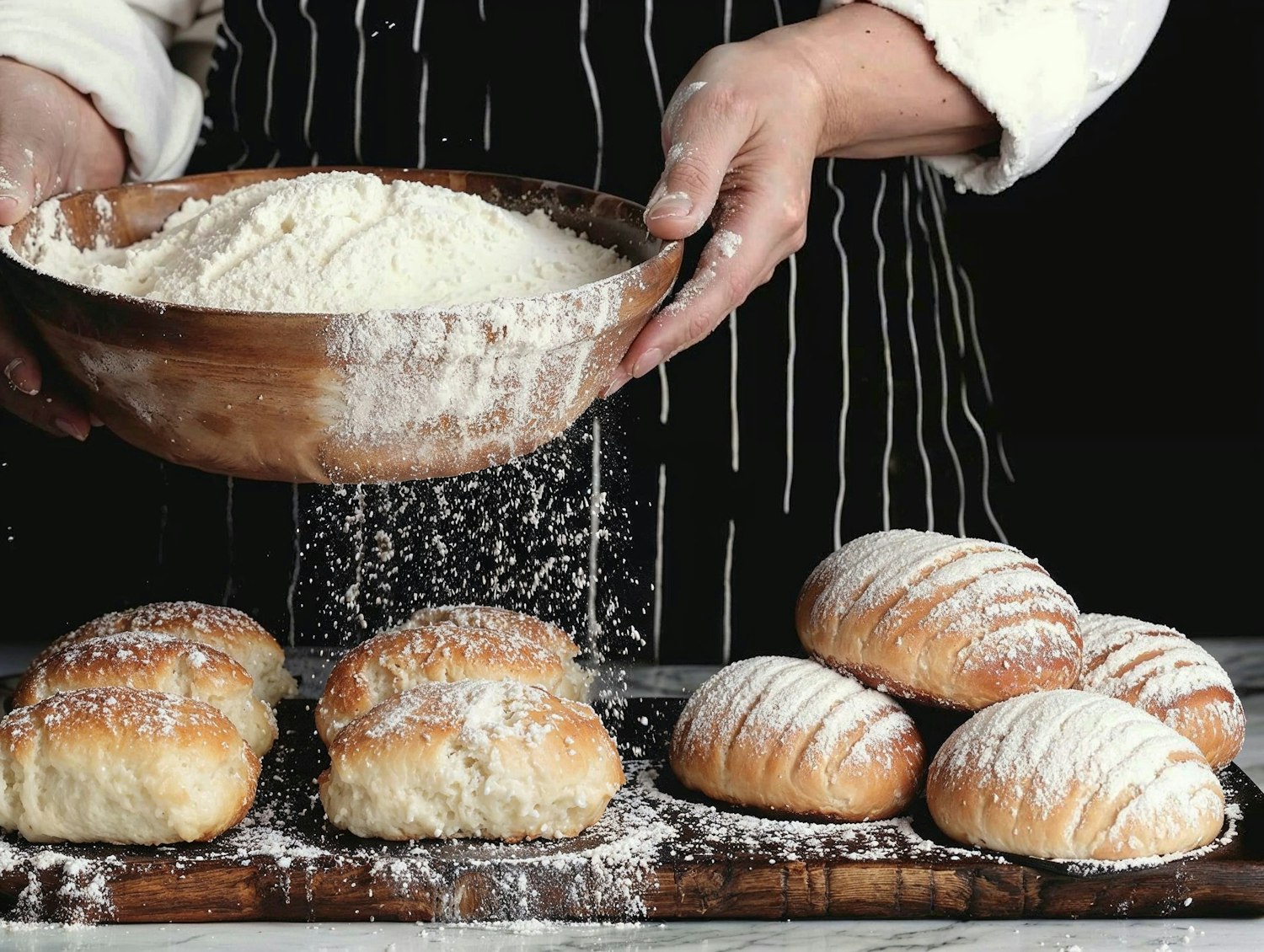 Baker dusting flour over golden bread rolls on a wooden board, creating a rustic and cozy baking scene.