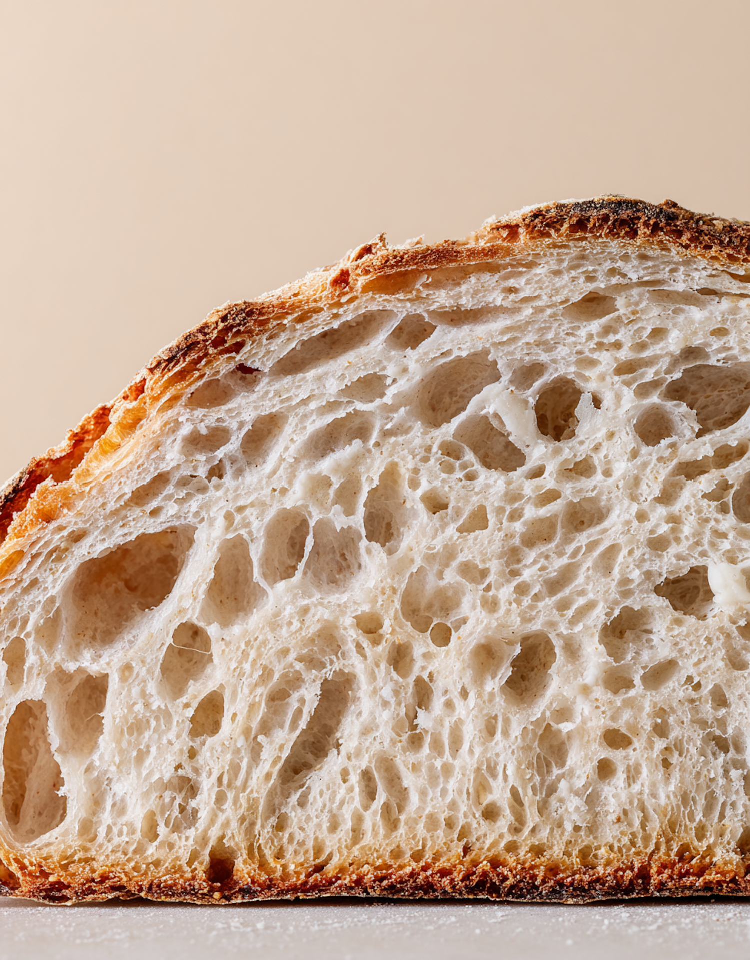 Close-up of a slice of artisan bread with a golden crust and airy crumb, perfect for showcasing its texture and quality.