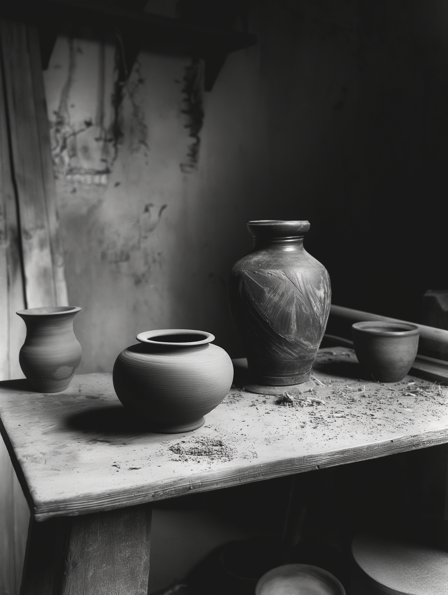 Black-and-white photo of a rustic pottery workshop with clay pots on a dusty wooden table, exuding artisanal charm.