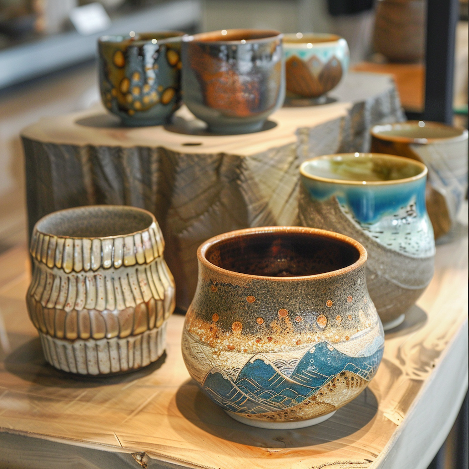Artisan ceramic cups with unique designs on a rustic wooden display, featuring textured patterns and landscape motifs.