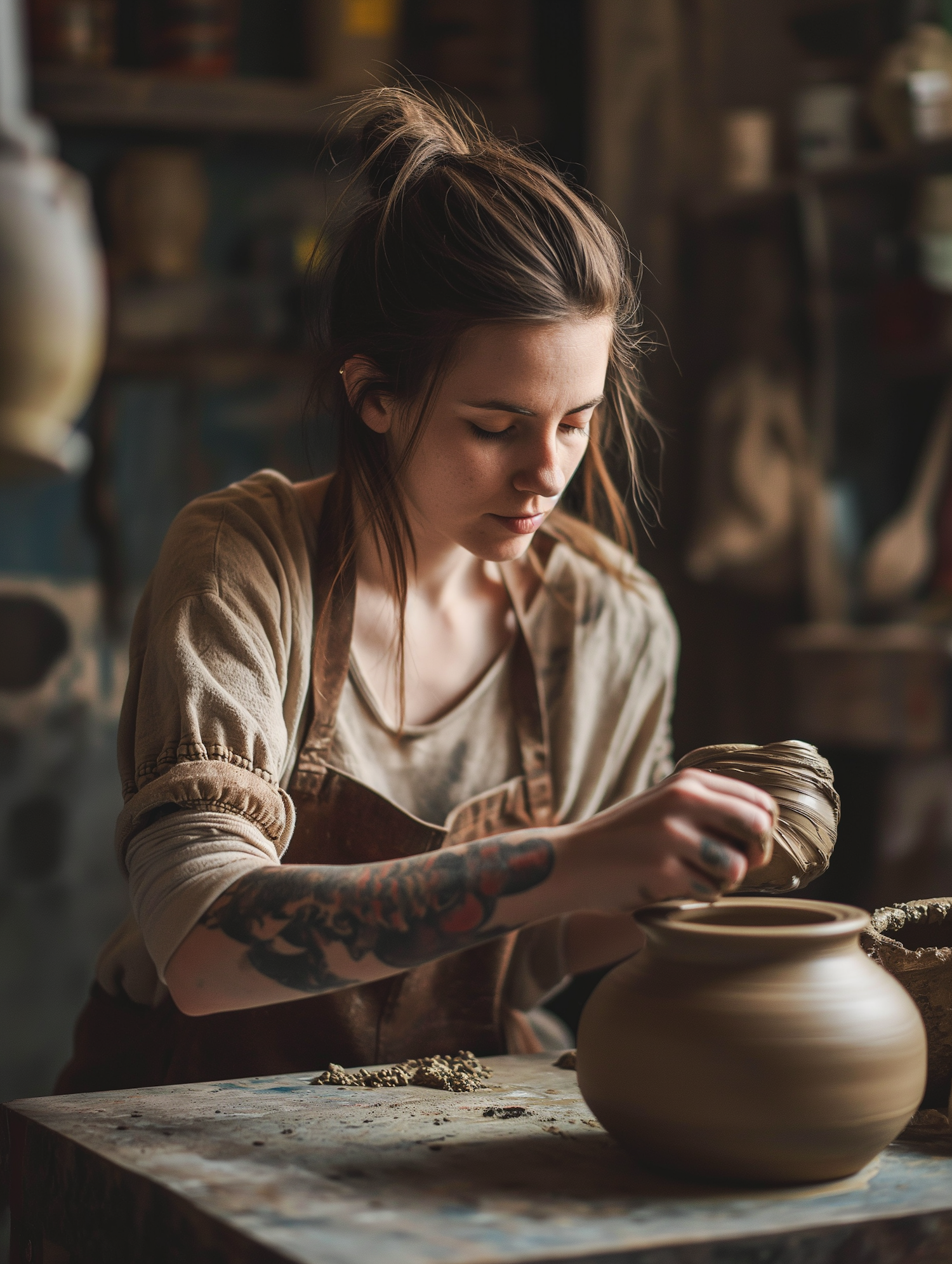 Young woman with tattoo crafting pottery in a rustic workshop, focused and artistic setting.