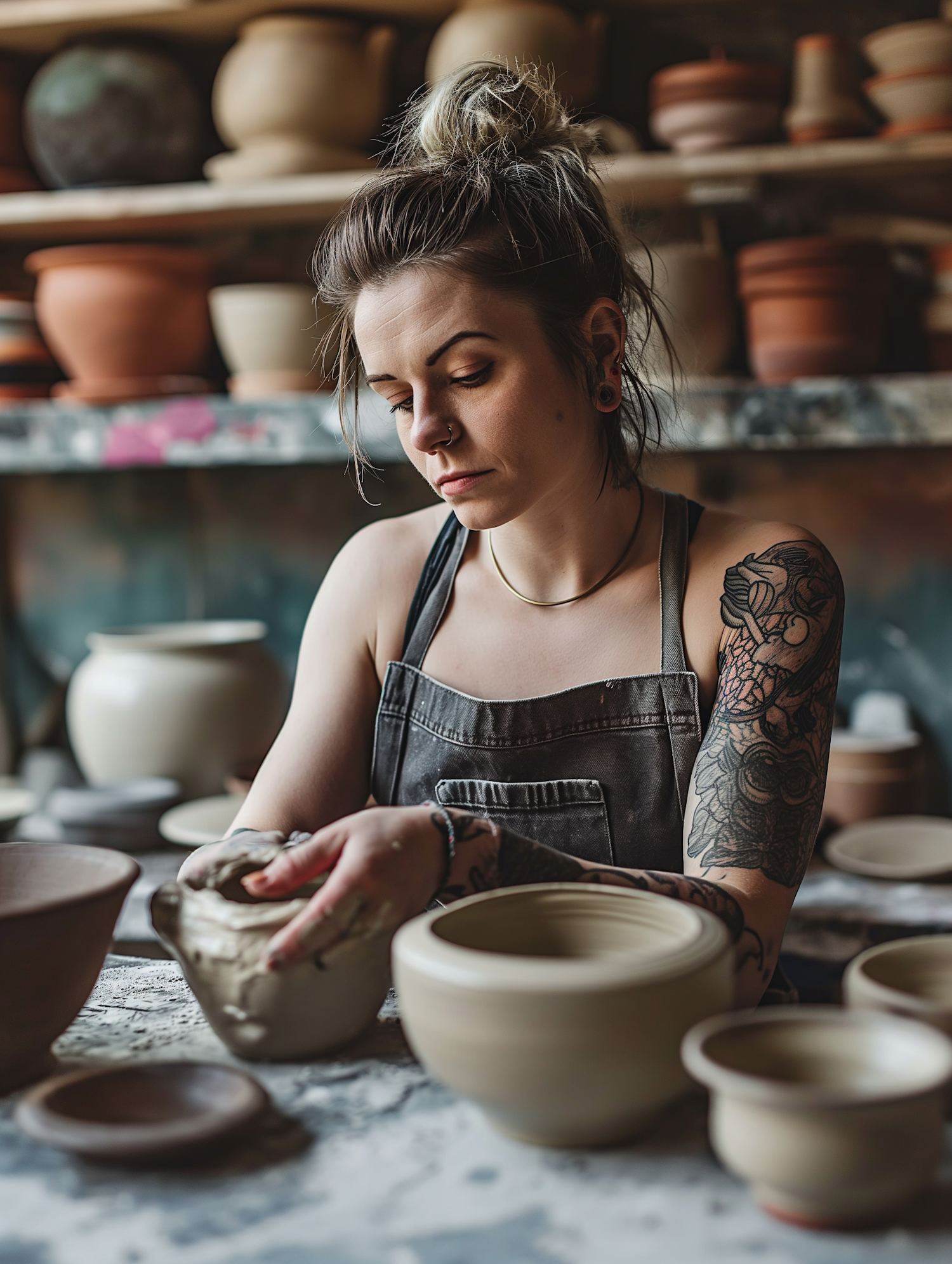 Young woman with tattoos crafting pottery in a studio, surrounded by clay pots and bowls, focused and creative atmosphere.