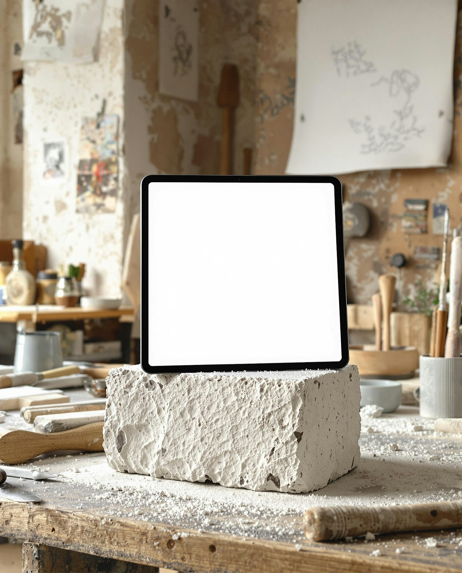 A digital mockup featuring a blank tablet screen (iPad-style, black bezel) placed on a sculptor’s worktable. The environment includes tools like chisels, sketches pinned to the wall, and marble dust scattered around. The tablet rests slightly tilted on a textured block of stone. Daylight enters from the left side, creating soft shadows and a creative atelier ambiance. The screen is fully white, with no UI or reflections.