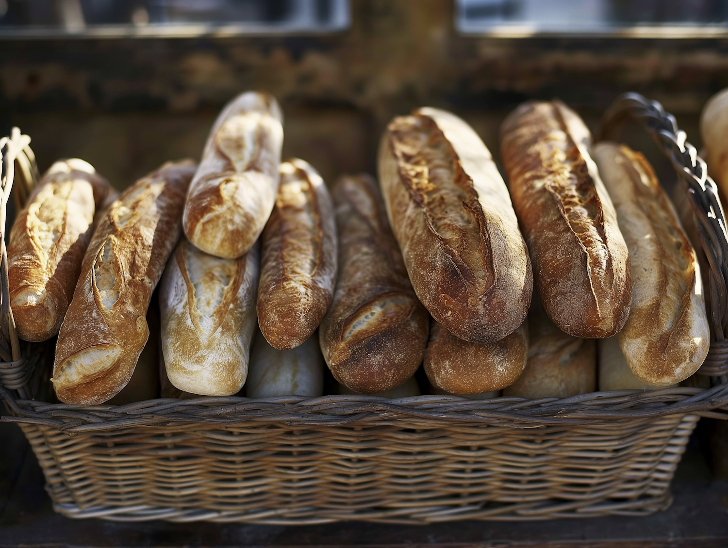 A wicker basket filled with freshly baked golden-brown baguettes, highlighting their crisp texture and artisanal quality.