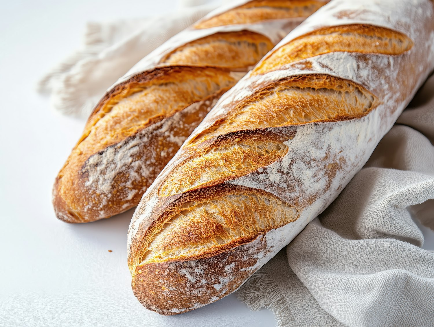 Golden-brown artisan baguettes with perfect scoring and a rustic touch, resting on a soft cloth for a cozy, inviting vibe.