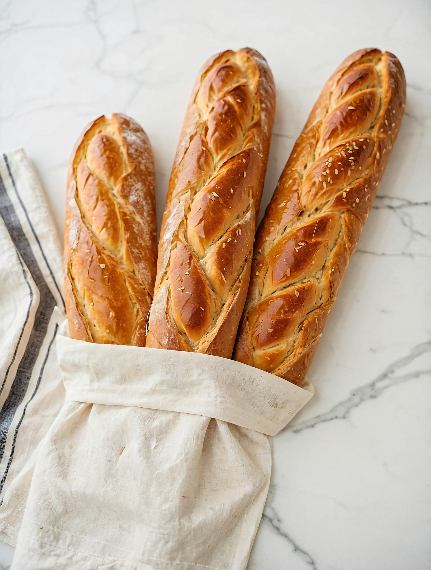 Three golden-brown baguettes with sesame seeds, wrapped in a white cloth, resting on a marble surface with a striped towel nearby.