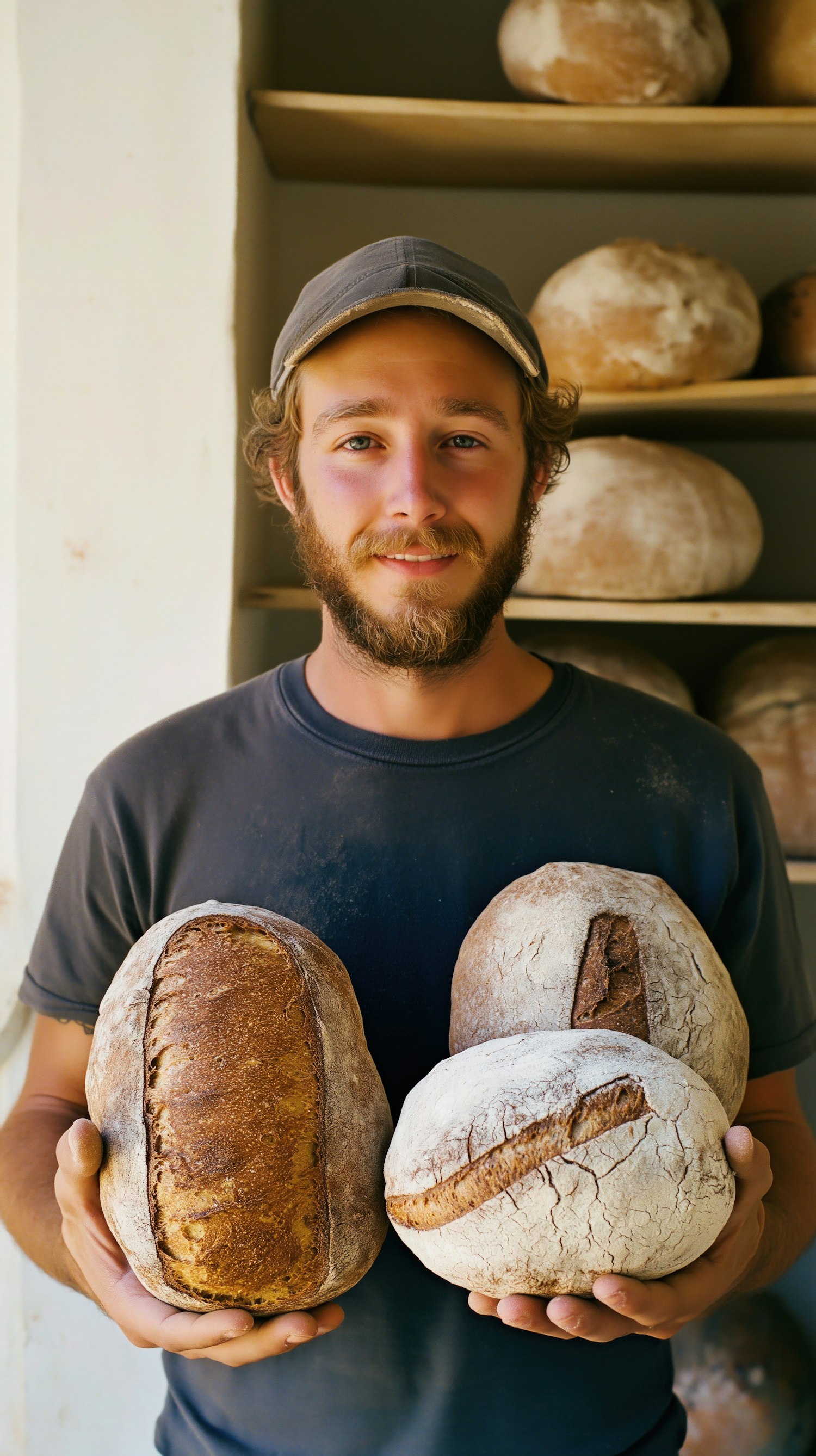 Young man with a beard holding artisanal bread loaves in a bakery setting, wearing a cap and dark t-shirt, smiling warmly.