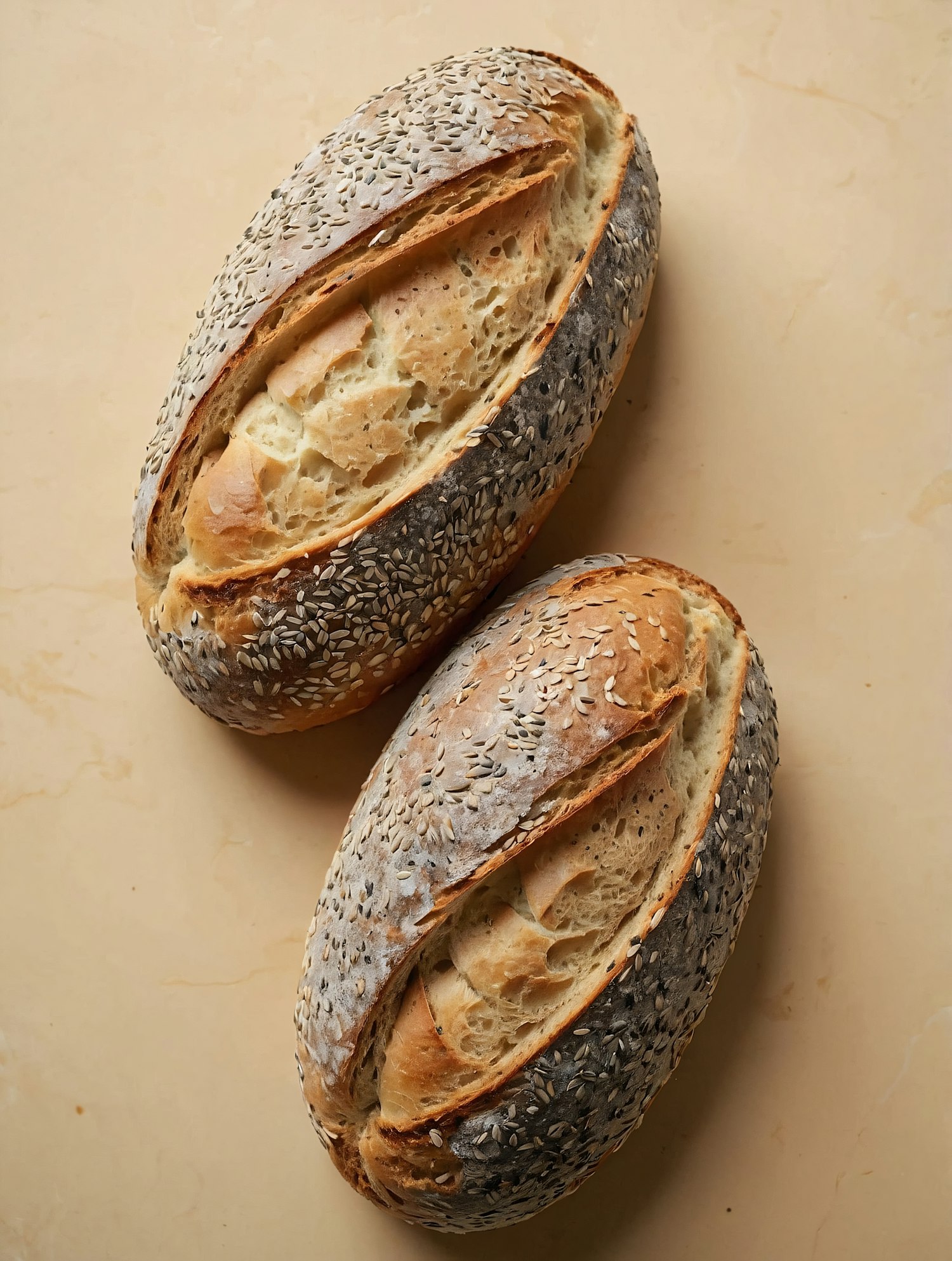 Two golden-brown sesame seed loaves with a rustic crust on a beige surface, showcasing their artisanal texture and airy interior.