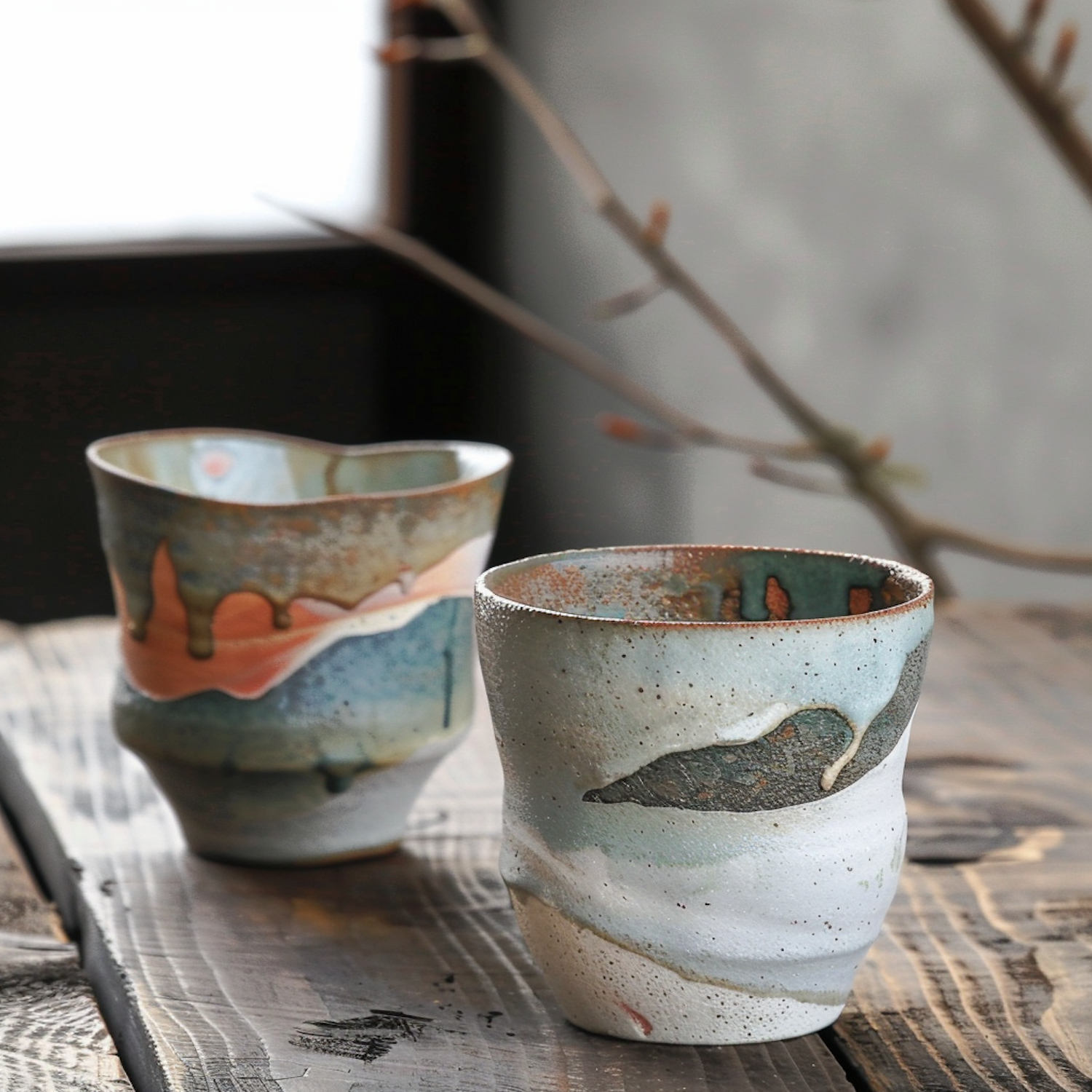 Two artisanal ceramic cups with earthy tones and abstract patterns on a rustic wooden table, evoking a minimalist, natural aesthetic.