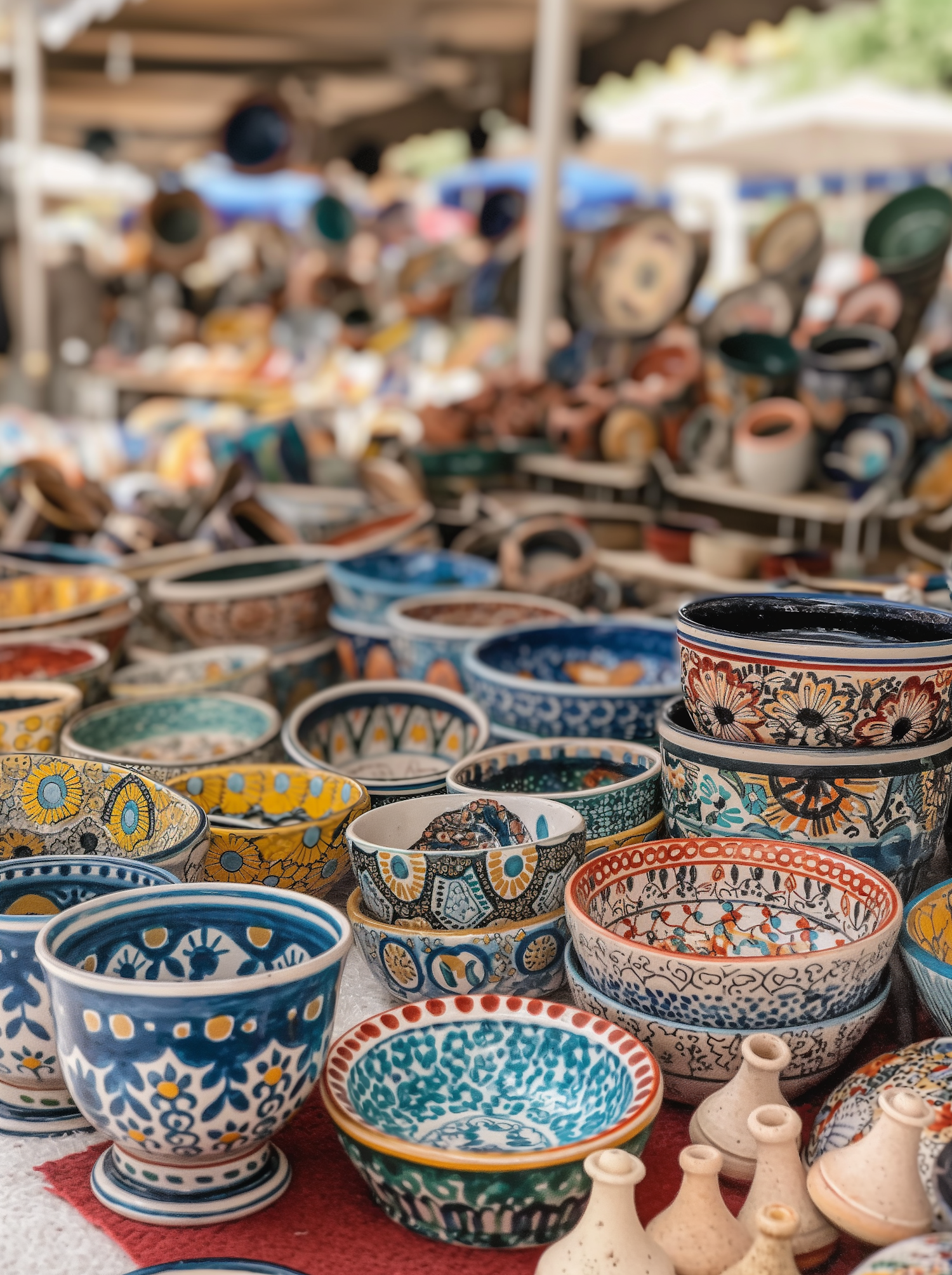 Colorful ceramic bowls with intricate patterns displayed at a market, showcasing vibrant designs and a variety of shapes.