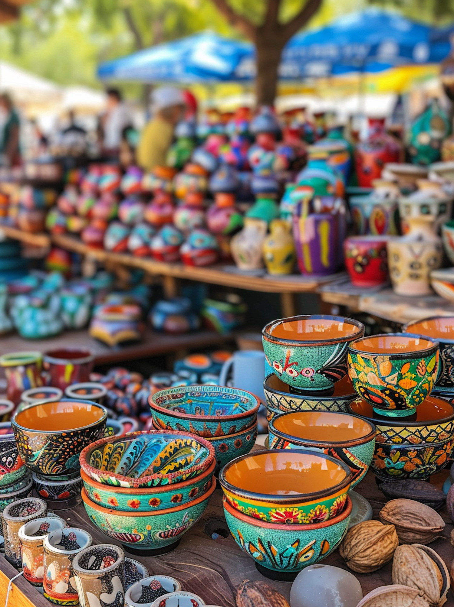Colorful hand-painted ceramic bowls and cups at an outdoor market, showcasing intricate designs and vibrant patterns.