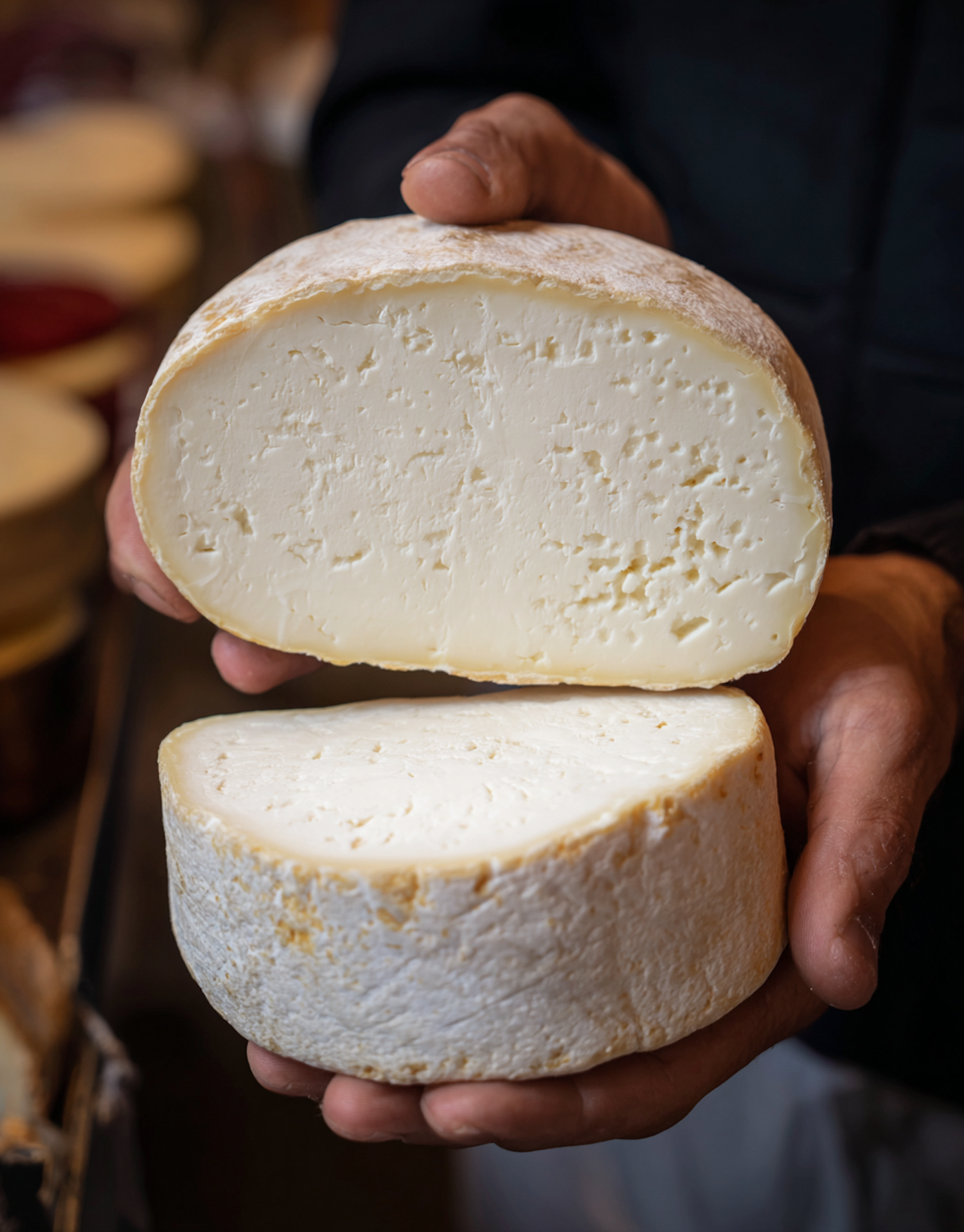 A close-up of a halved wheel of cheese with a creamy interior and rustic rind, held by hands in a market-like setting.