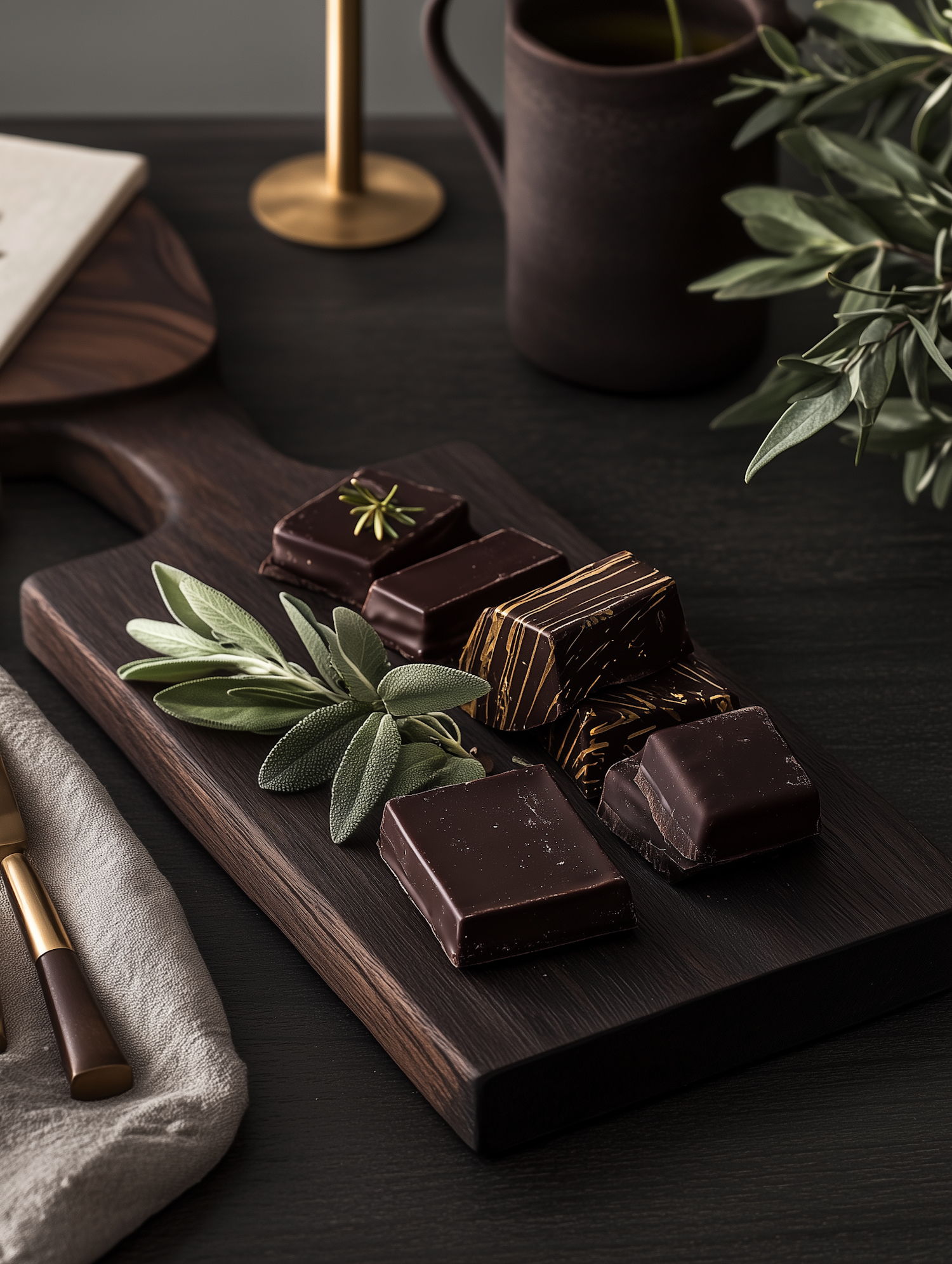 Elegant dark chocolate squares on a wooden board with fresh herbs, paired with a black mug and gold accents for a refined presentation.