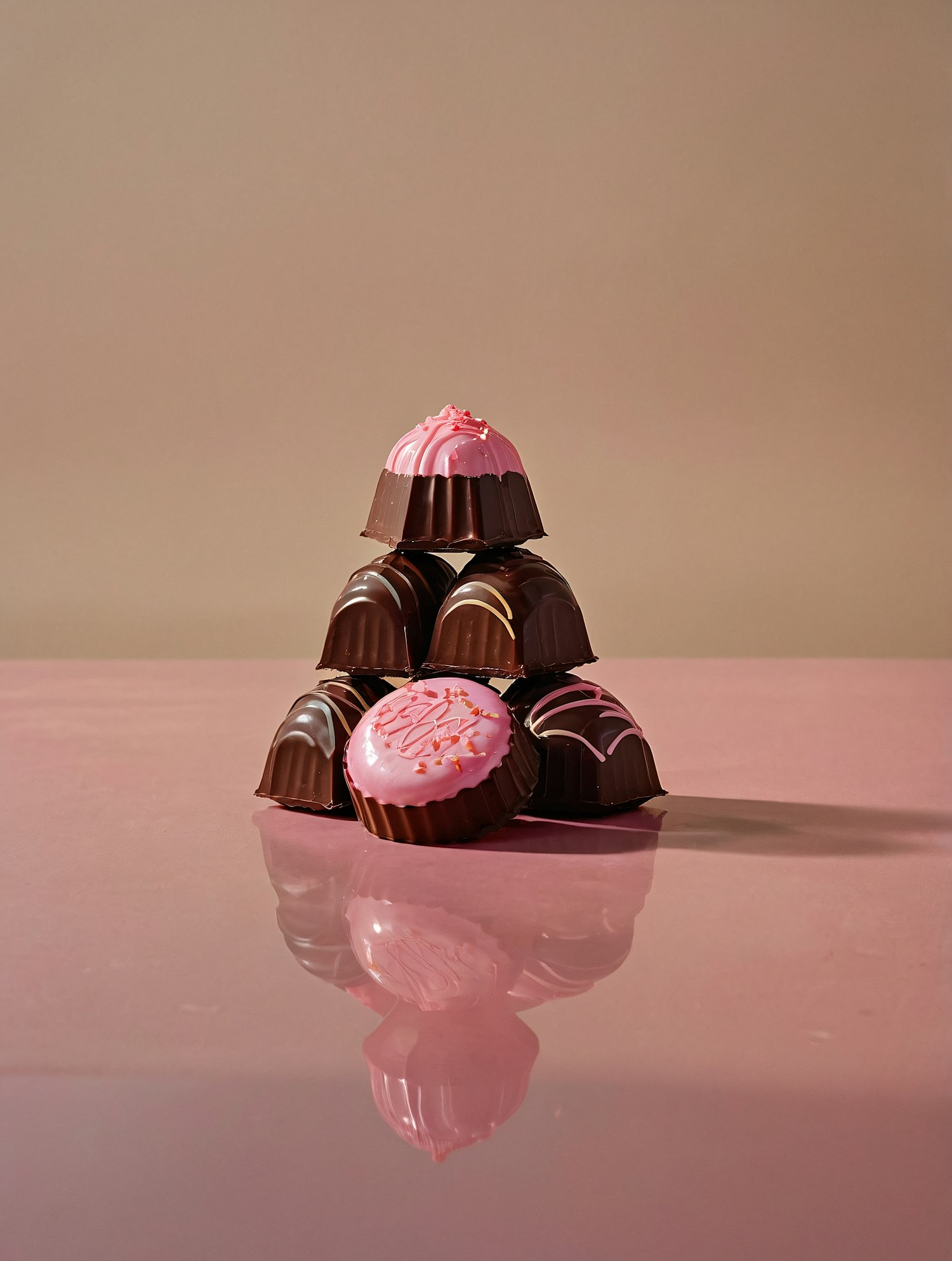 A pyramid of pink and dark brown artisanal chocolates on a glossy pink surface, with intricate designs and a mirrored reflection.