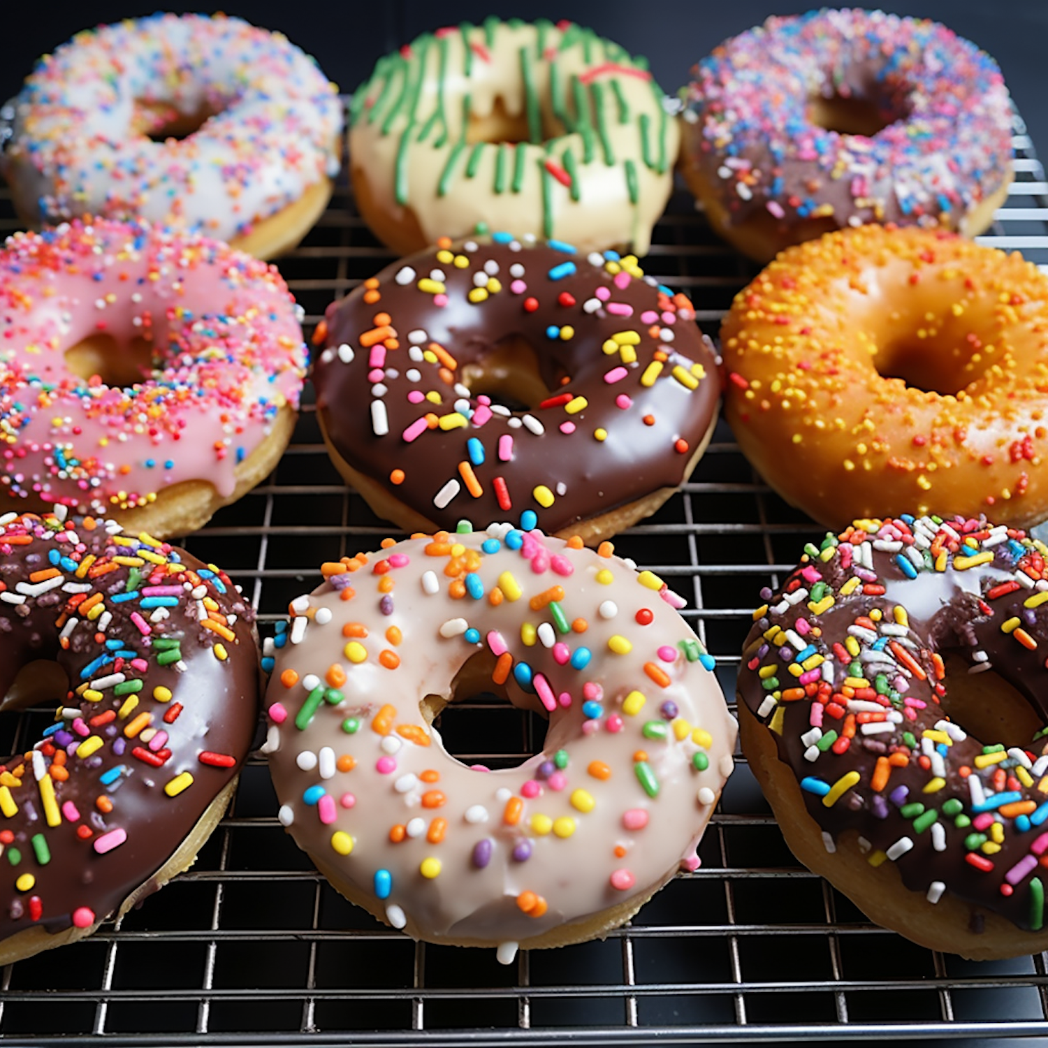 Colorful donuts with icing and sprinkles on a cooling rack, featuring vibrant pink, chocolate, and white glazes.