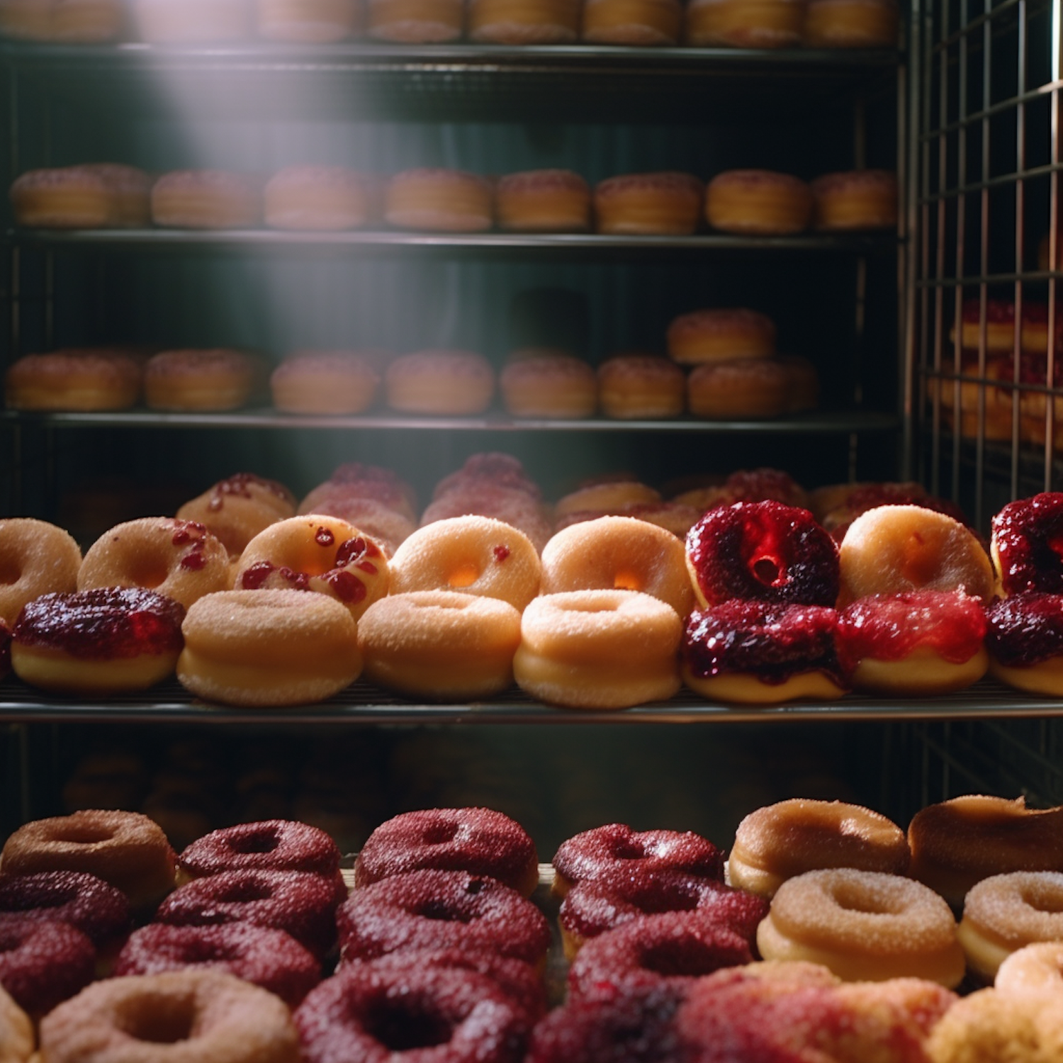 A tempting display of assorted donuts with berry glaze and sugar coating, beautifully arranged on bakery racks.