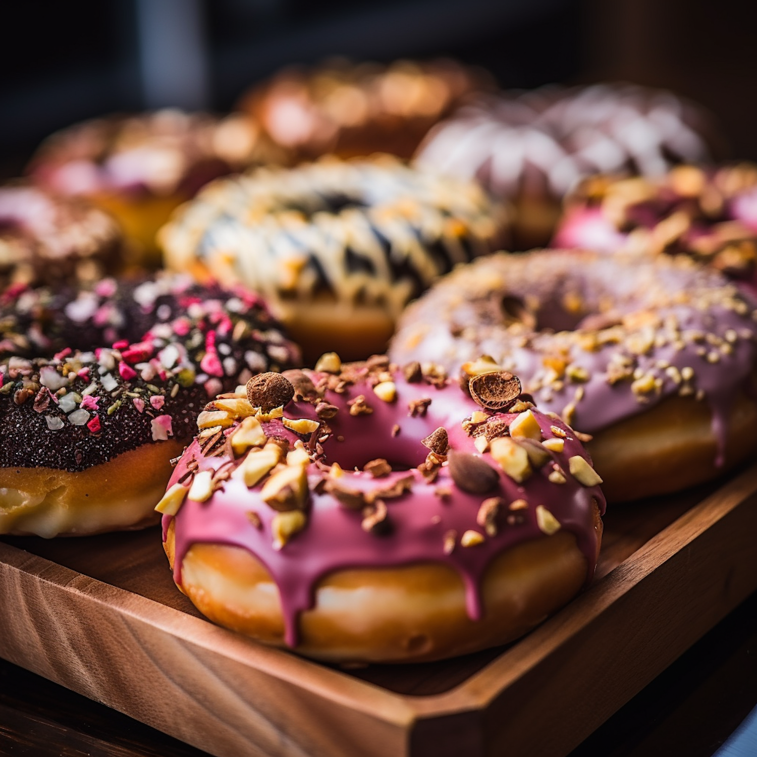 A tray of colorful donuts with various toppings, including nuts and chocolate, arranged closely together, creating a tempting display.