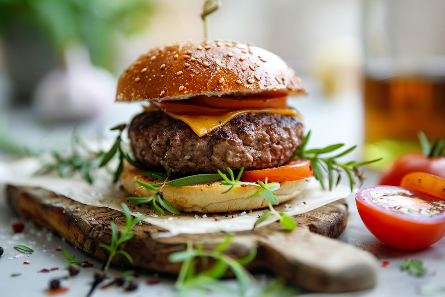 Delicious gourmet burger with cheddar cheese, tomato, and fresh herbs on a rustic board. Perfect for food lovers and culinary enthusiasts.