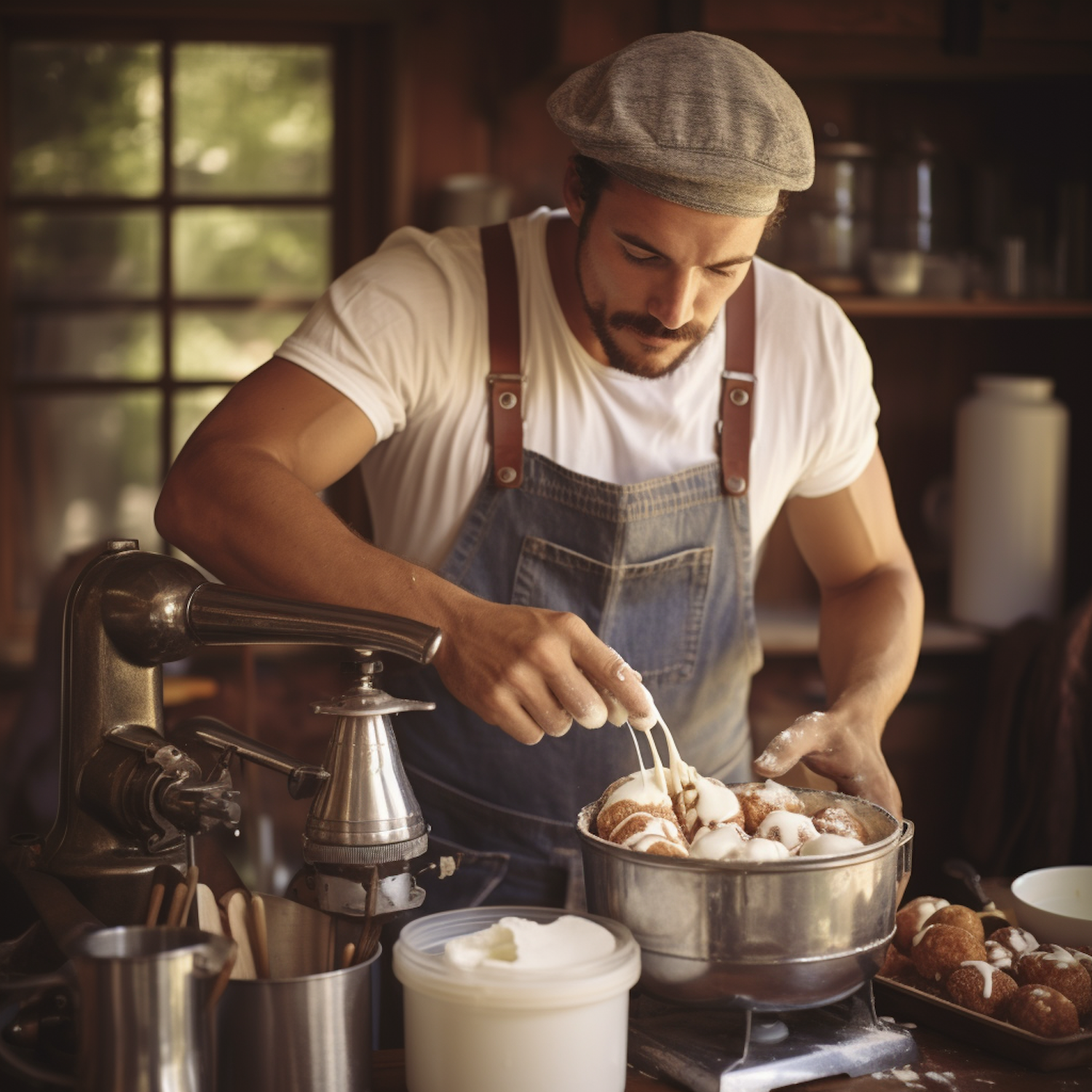 Man in rustic kitchen icing doughnuts, wearing denim overalls and a flat cap, surrounded by vintage baking tools and warm lighting.