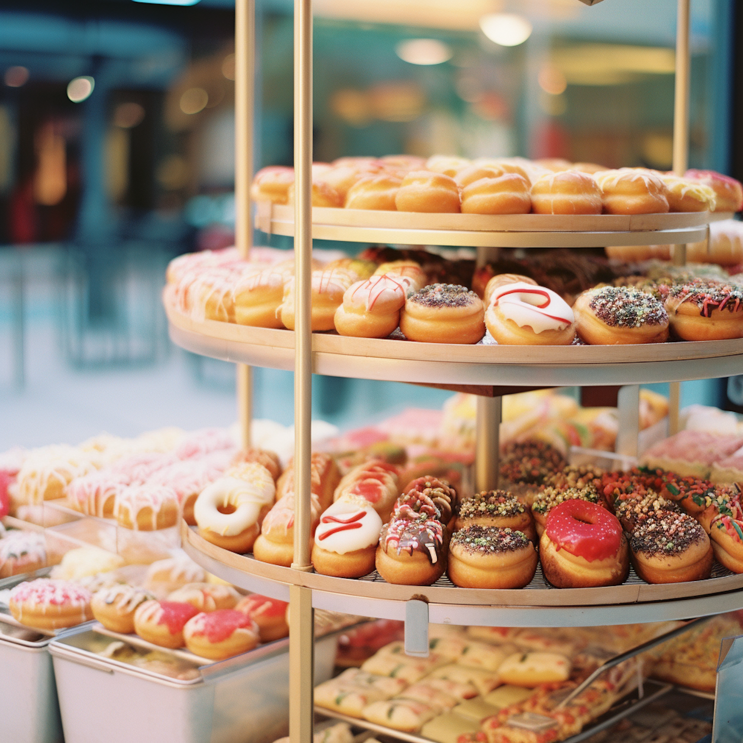 A colorful display of assorted donuts with sprinkles and icing on a multi-tiered stand in a bakery setting.
