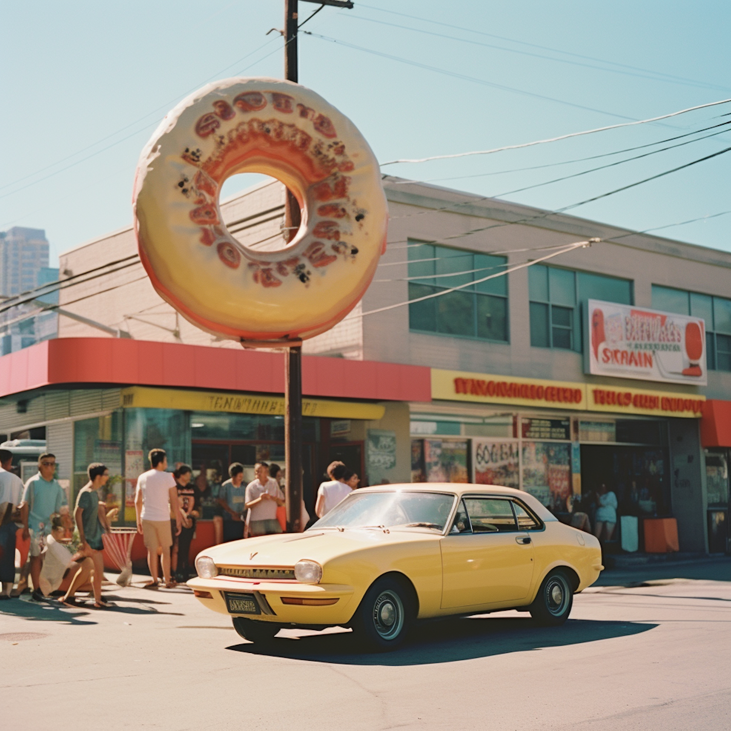 Vintage yellow car parked in front of a retro donut shop with a giant donut sign, surrounded by people on a sunny day.