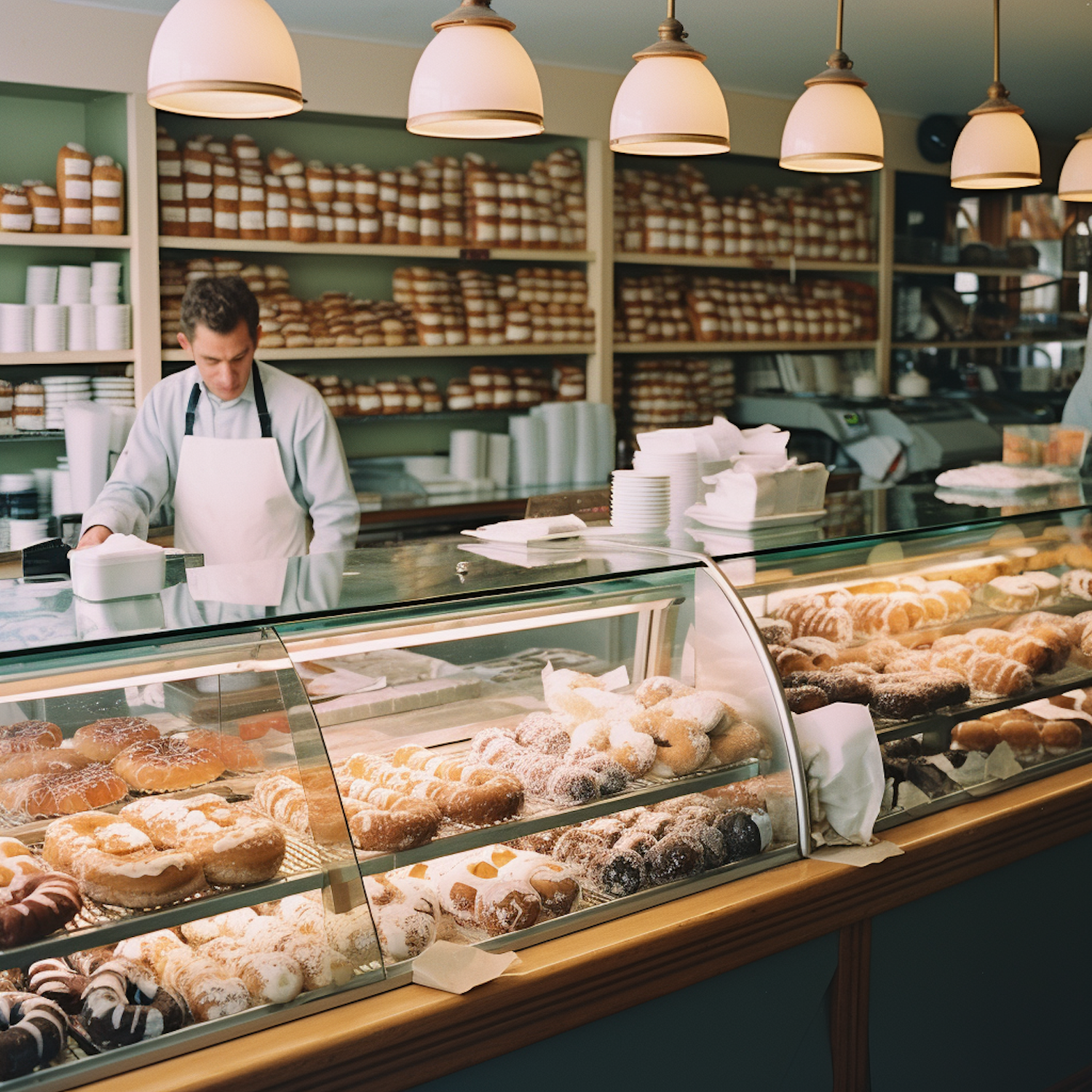 Cozy bakery with fresh pastries and bread, warm lighting, and a focused baker in a white apron behind the counter.