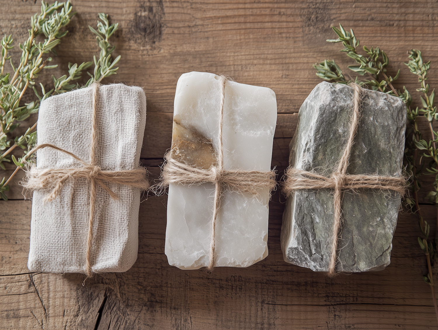 Artisanal soap bars tied with twine on rustic wood, featuring natural textures and fresh herbs for an organic aesthetic.