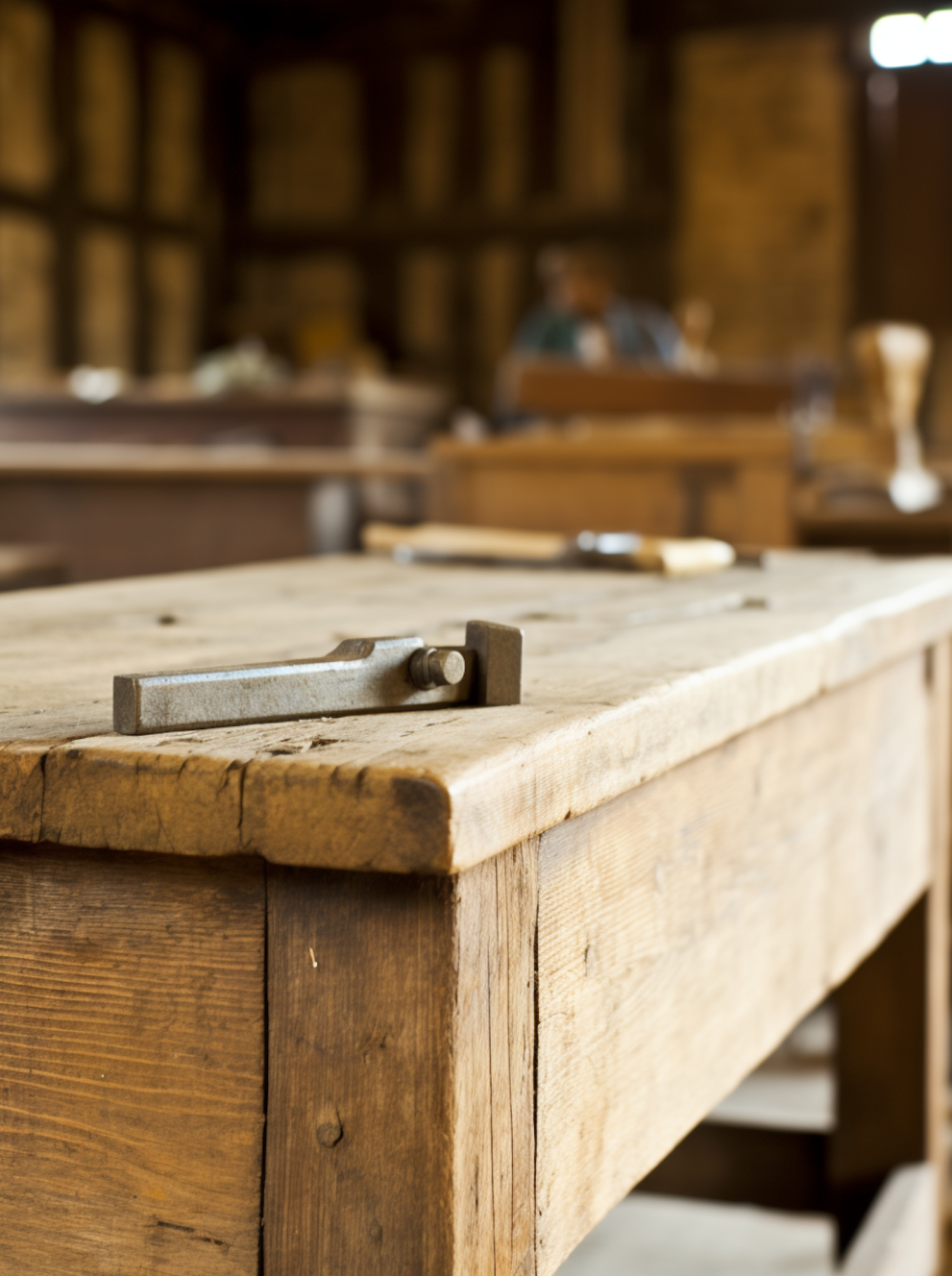 Rustic wooden workbench with a metal tool in a warm, softly lit workshop setting, evoking craftsmanship and tradition.