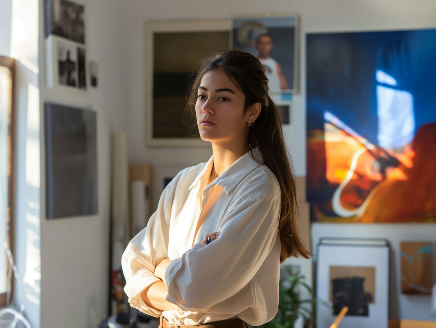 Confident woman in art studio with crossed arms, surrounded by colorful paintings and natural light.