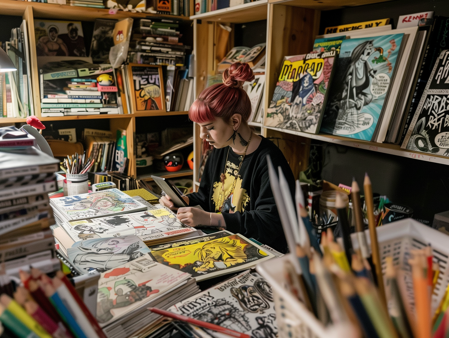 Young woman with red hair creating art in a vibrant comic-filled workspace, surrounded by colorful books and art supplies.