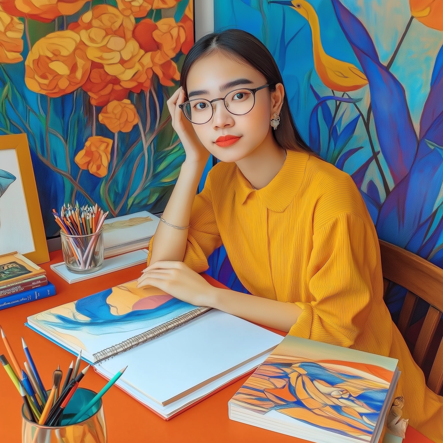 Asian woman in yellow blouse at a colorful art desk with paintings, sketchbooks, and pencils, creating a vibrant artistic atmosphere.