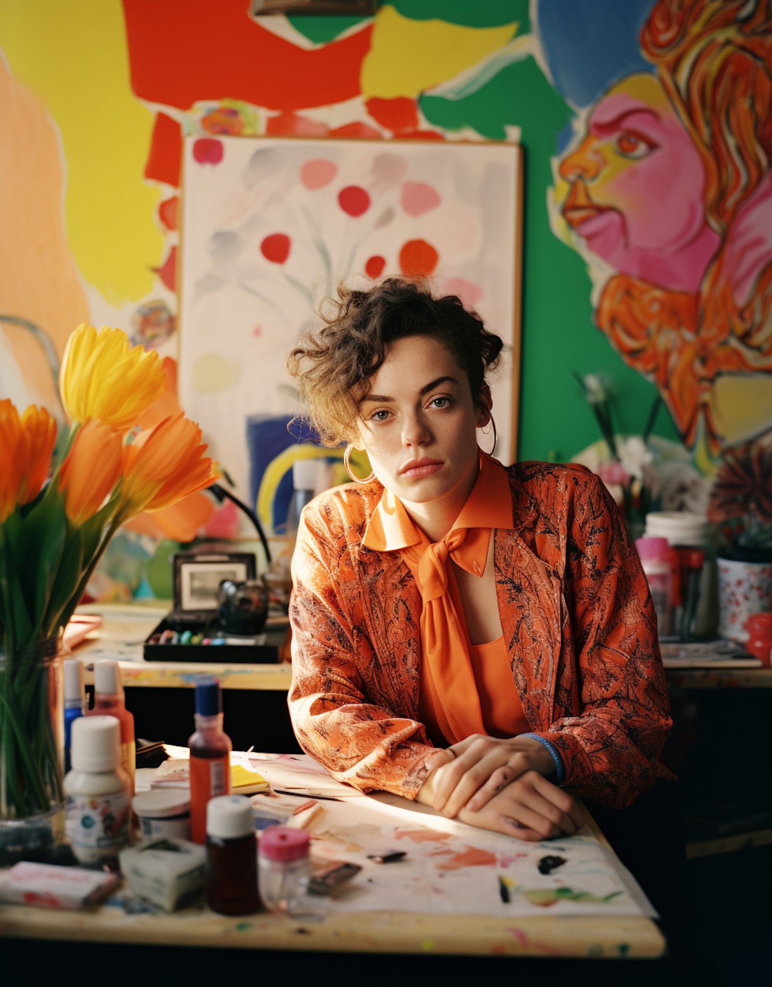 Young woman in an orange outfit sits at an artist's desk with colorful paintings and tulips, creating a vibrant, creative scene.