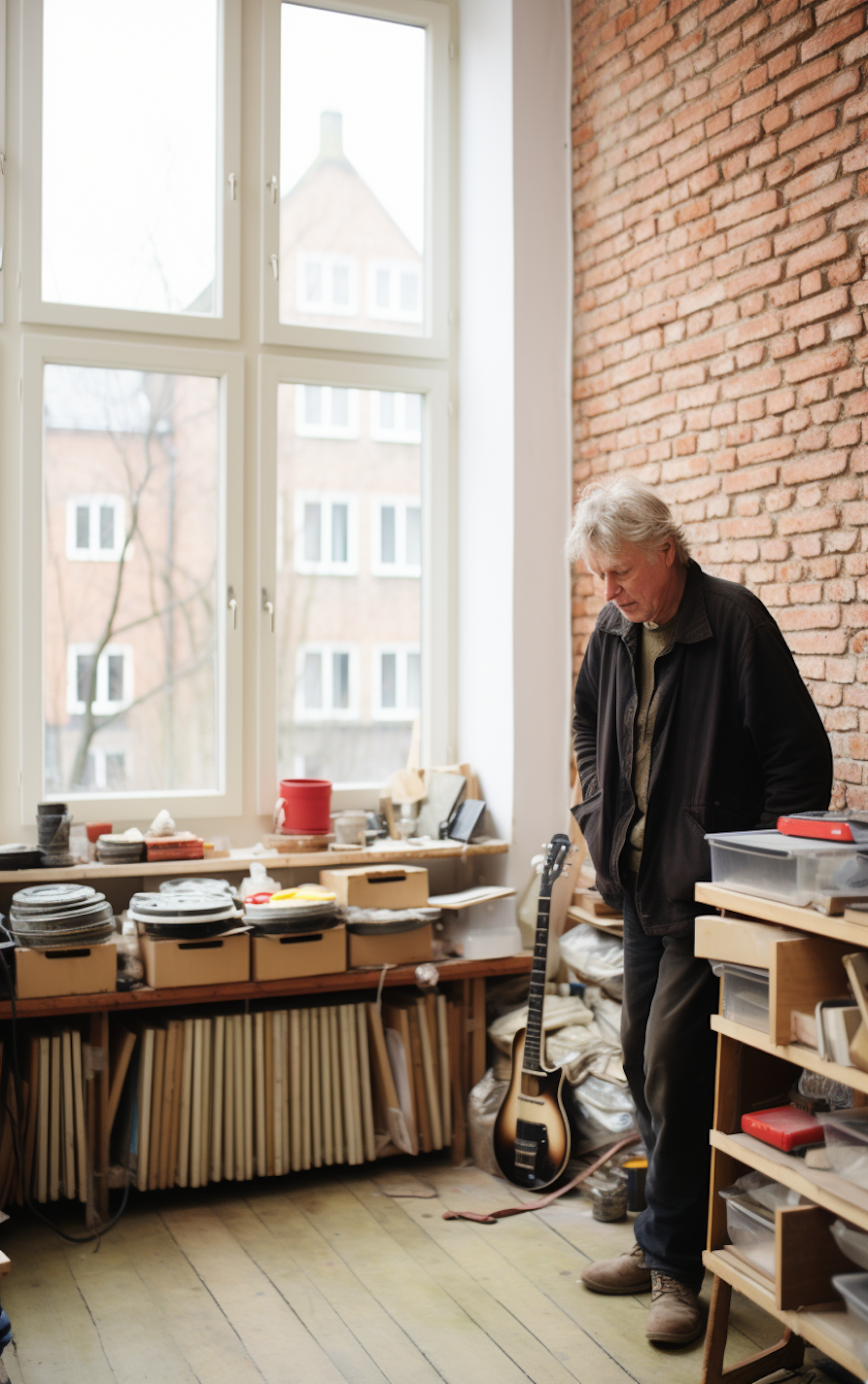 Caucasian man in a creative studio with art supplies and a guitar, standing by a large window with exposed brick walls.