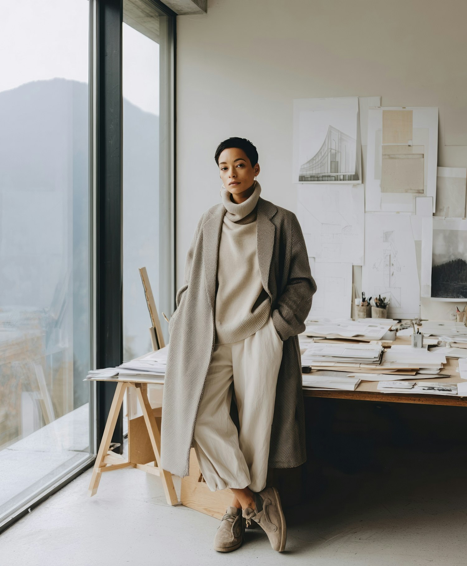 An artist standing by a workspace filled with sketches, wearing a stylish outfit in a modern studio with large windows and mountain views.