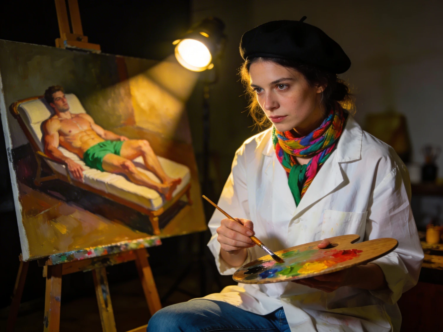 a woman Artist painting on a canvas in a dimly lit studio.wearing a black beret blue jeans and a white smock, with colorful scarf around her neck, holding a palette in one hand and a brush in the other. the painting on the easel depicts a muscular male model in a relaxed pose, wearing a green shorts , laying on a chase lounge in the background. the studio is illuminated by a spotlight, casting dramatic shadows and emphasizing the artist's focused expression. the background is minimal, with some indistinct objects and a warm, artistic atmosphere.