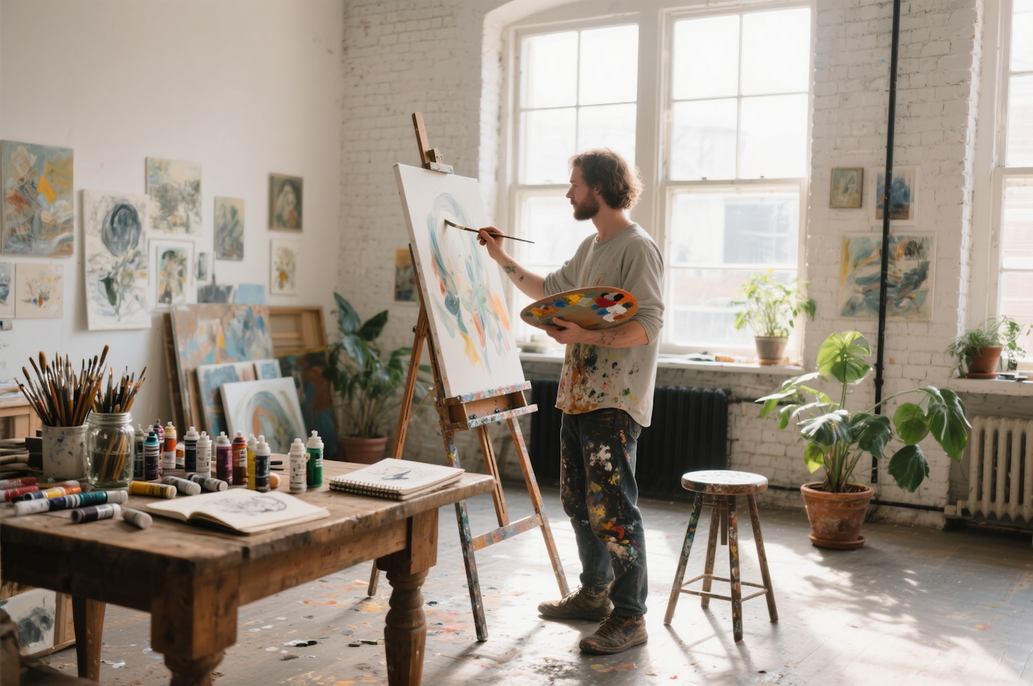 An artist painting in a bright studio filled with art supplies, natural light, and greenery, creating a vibrant and inspiring workspace.