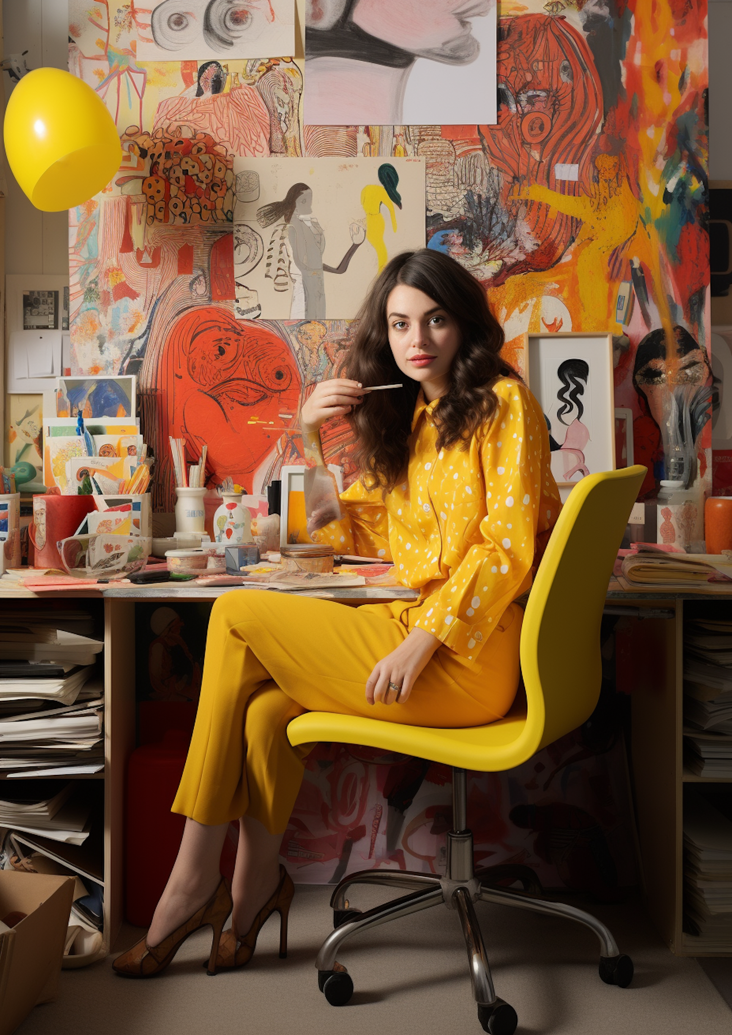 Artist in a vibrant yellow outfit sits in a creative studio filled with colorful artworks and art supplies.