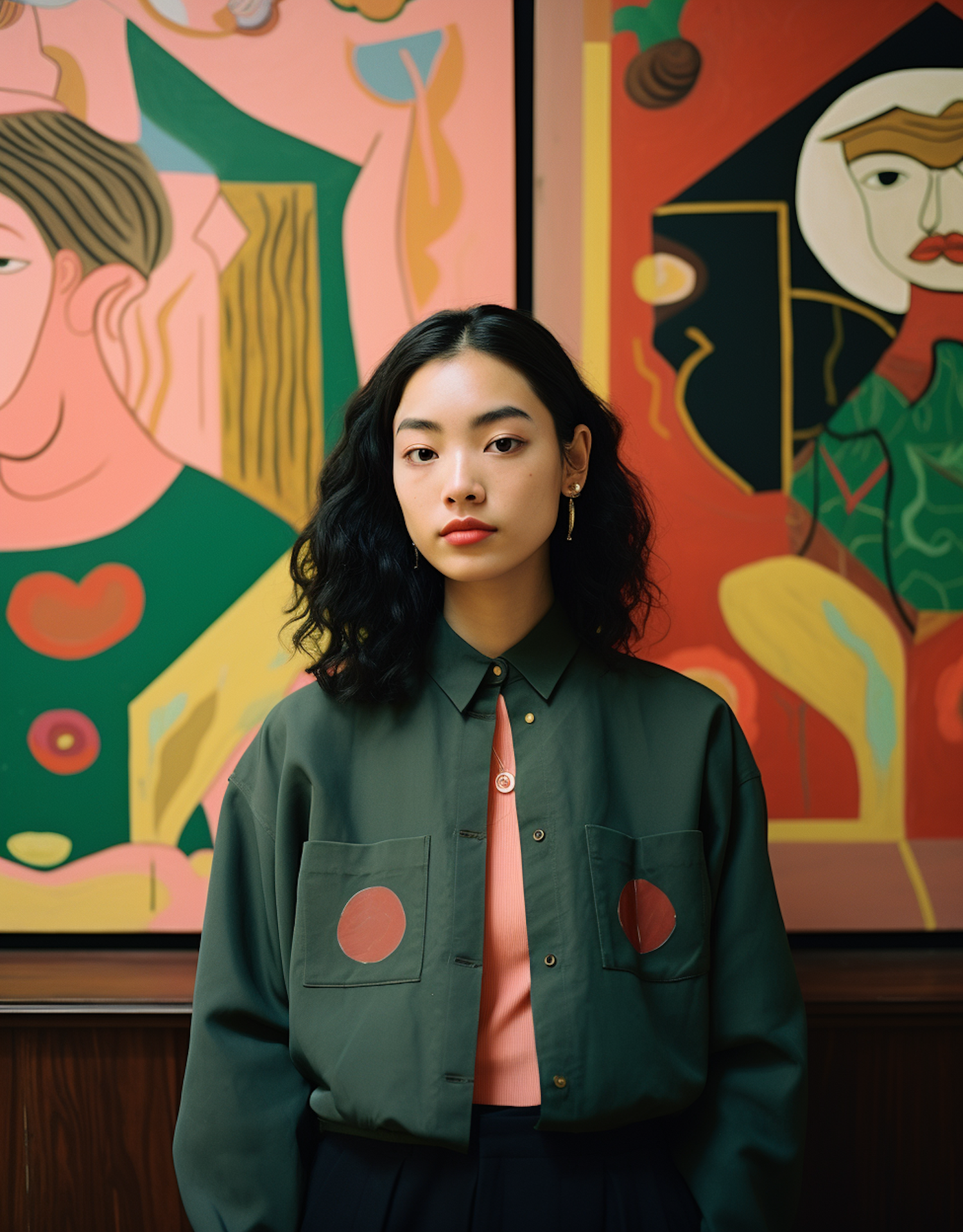 Asian woman with wavy black hair in front of vibrant abstract art, wearing a green shirt and pink undershirt, exuding elegance.