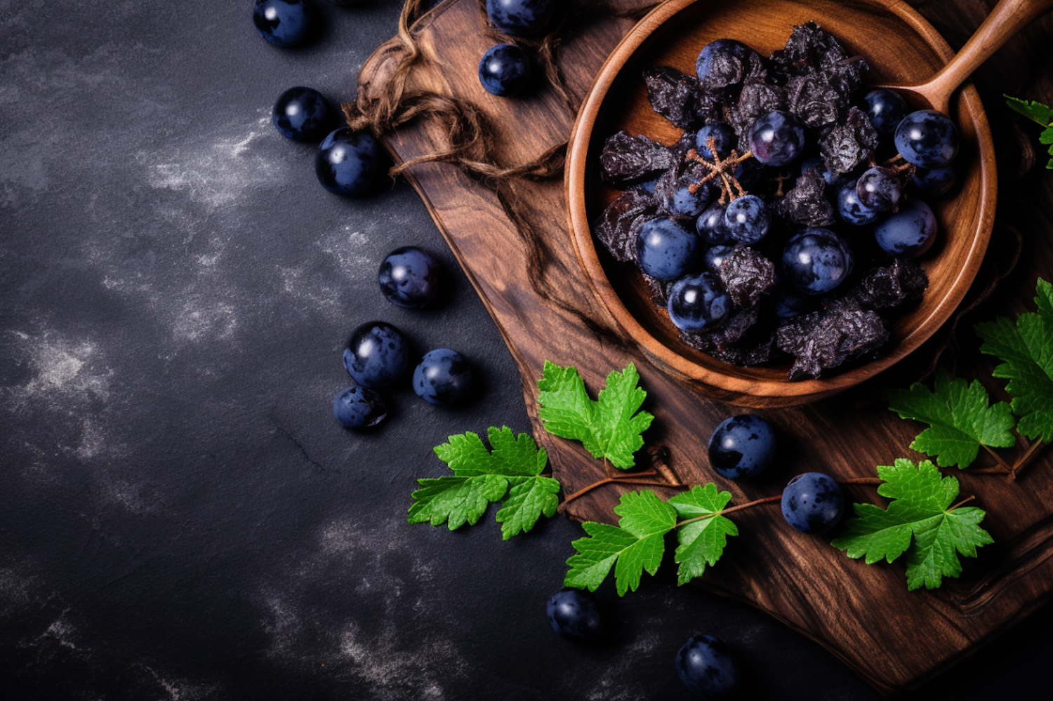 Rustic display of fresh and dried grapes with green leaves on a wooden board, set against a dark textured background.