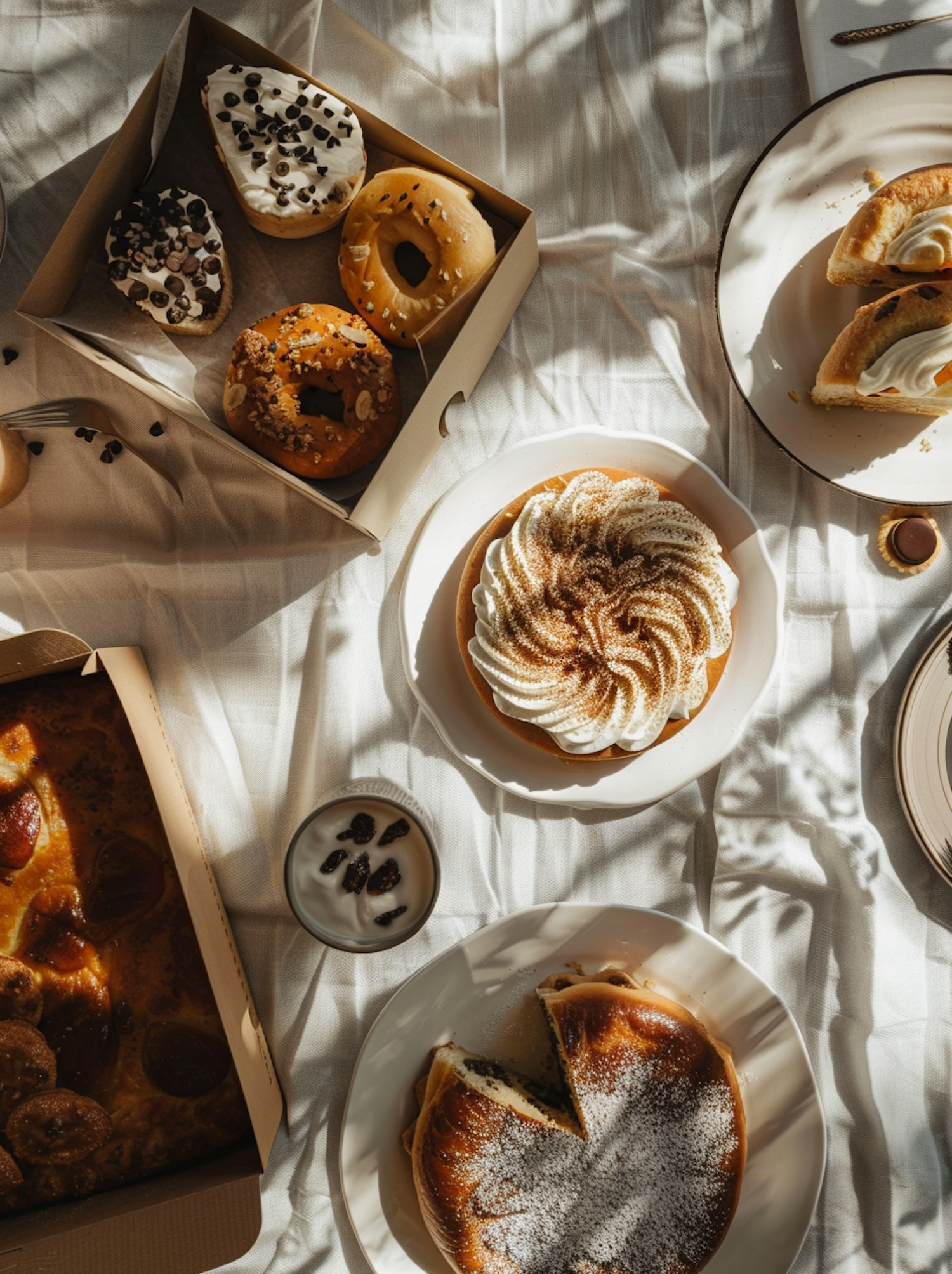 A cozy spread of donuts, pie, and cake on a sunlit tablecloth, featuring chocolate toppings and whipped cream.